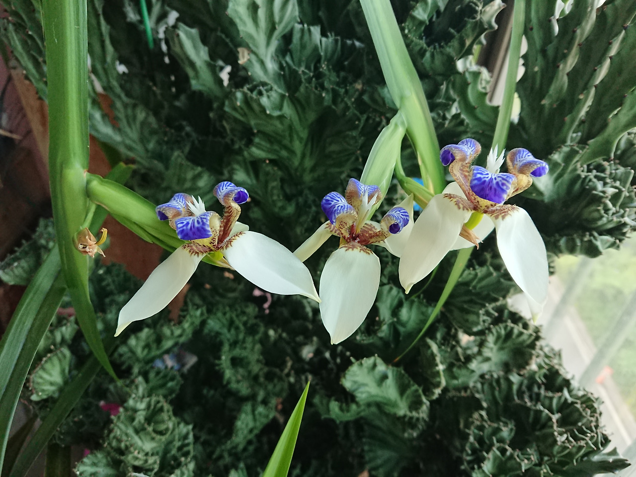 네오마리카 꽃대 내려 선인장 위에 피어있다