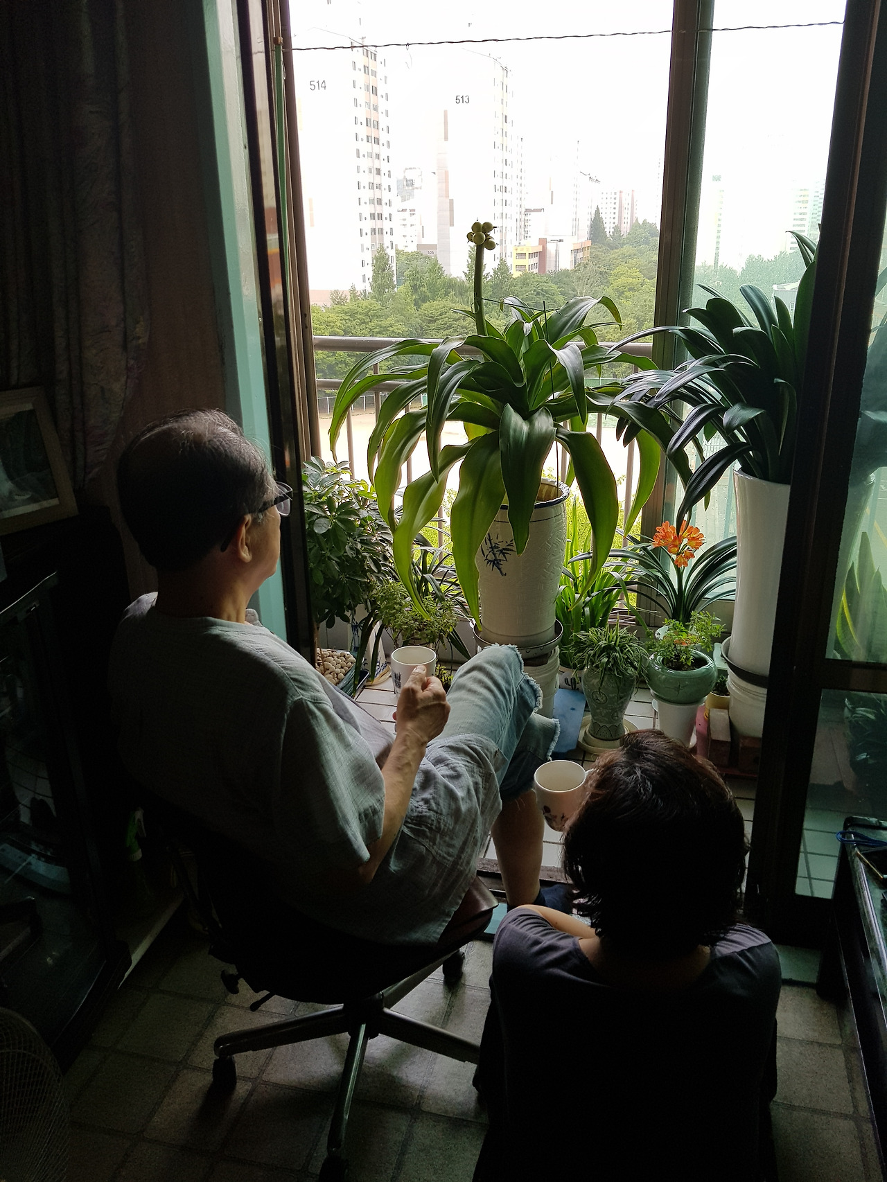 발코니 안 어울림과 창 너머 자연 싱그럽고