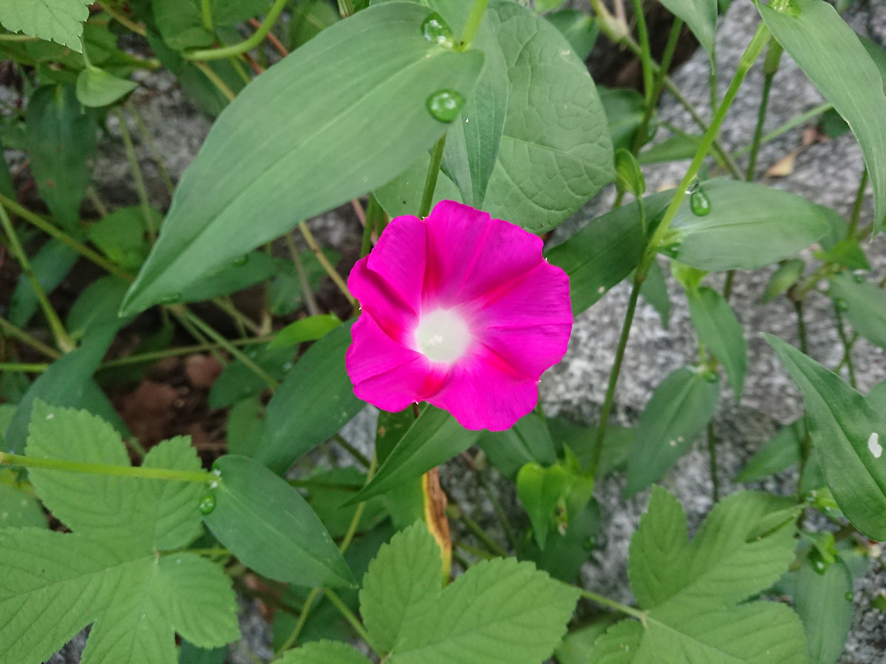 새벽 잔비 속 피어난 핑크빛 나팔꽃