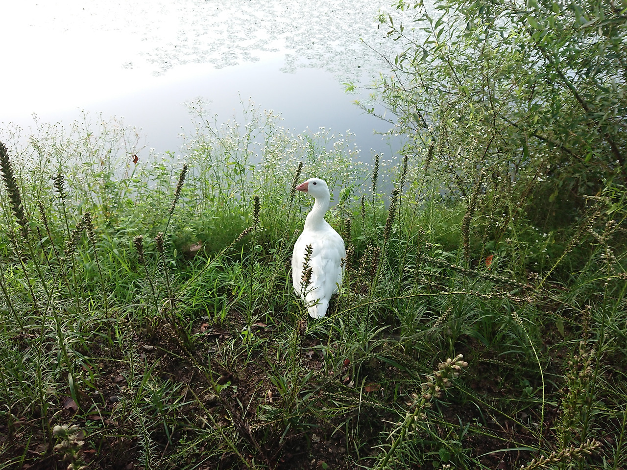 호숫가 풀숲에 하얀 오리 한 마리