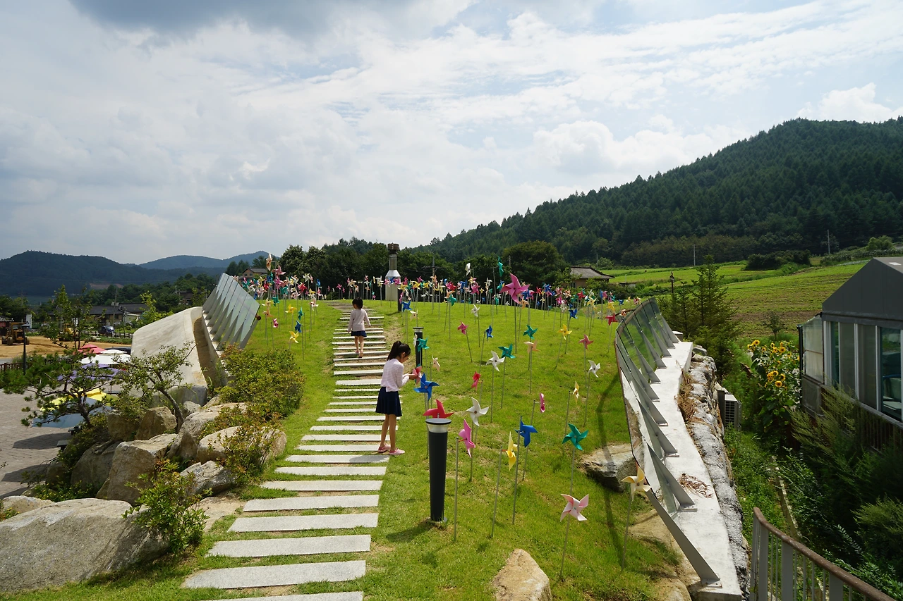 당나귀를 내려오니 바람의 언덕으로 이어지는 언덕에 이효석하면 떠오르는 커다란 둥근 안경과 수많은 작품을 써냈을 거대한 만년필이 옆에 와서 기념사진 찍고 가라 부르고 바로 옆에는 바람의 언덕답게 수백 개의 바람개비가 환영의 파티를 열고 있었으며 이곳에 오면 누구나 동심으로 들어갈 수밖에 없을 것 같아 잠시 어린아이 되어 팔 벌려 바람개비와 함께 춤추며 마음속 삶의 찌꺼기들을 다 쏟아내고 행복한 미소 담뿍 가슴에 담고 발길을 돌린다