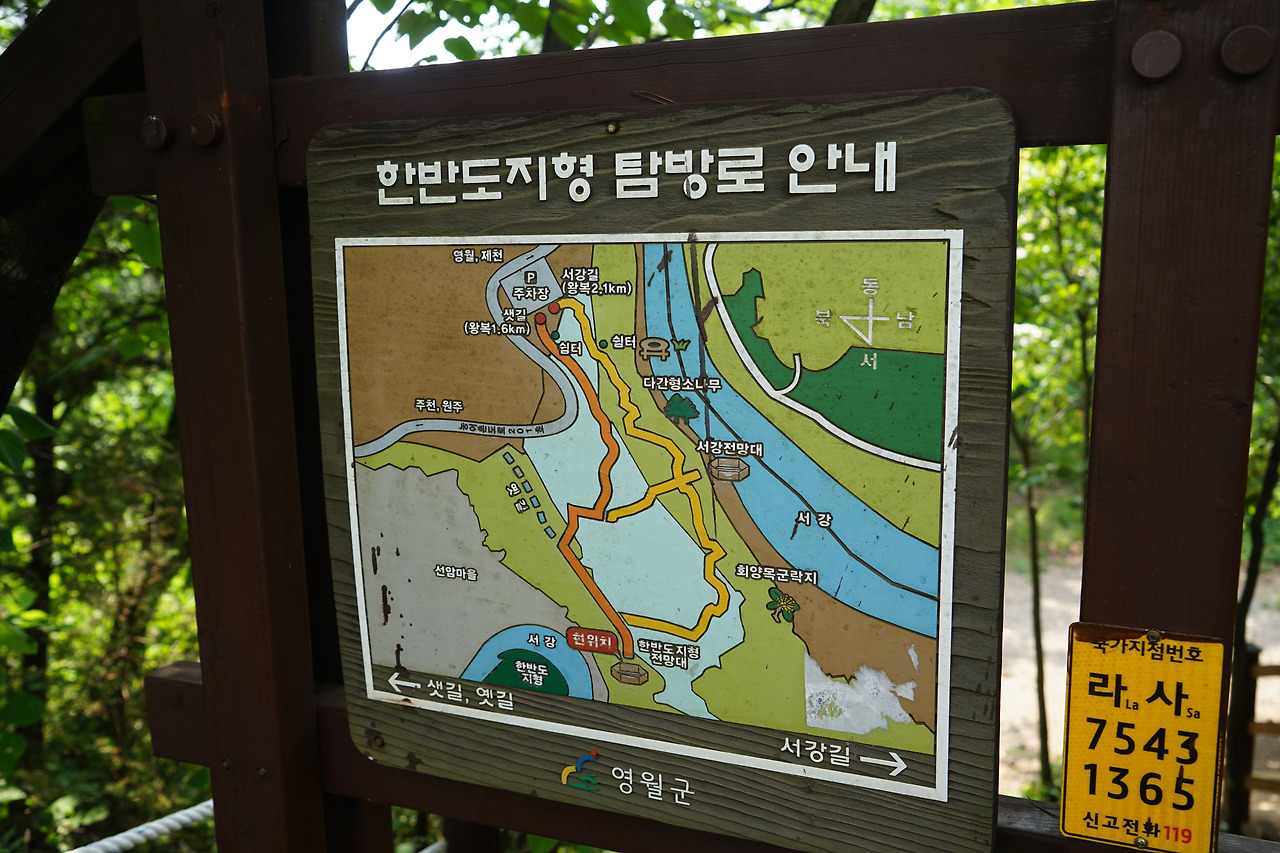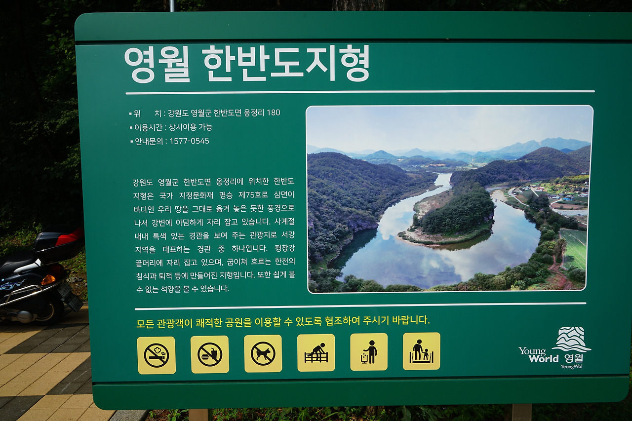 강원도 영월군 한반도면에 위치한 삼면이 평창강으로 둘러싸인 우리나라의 지형을