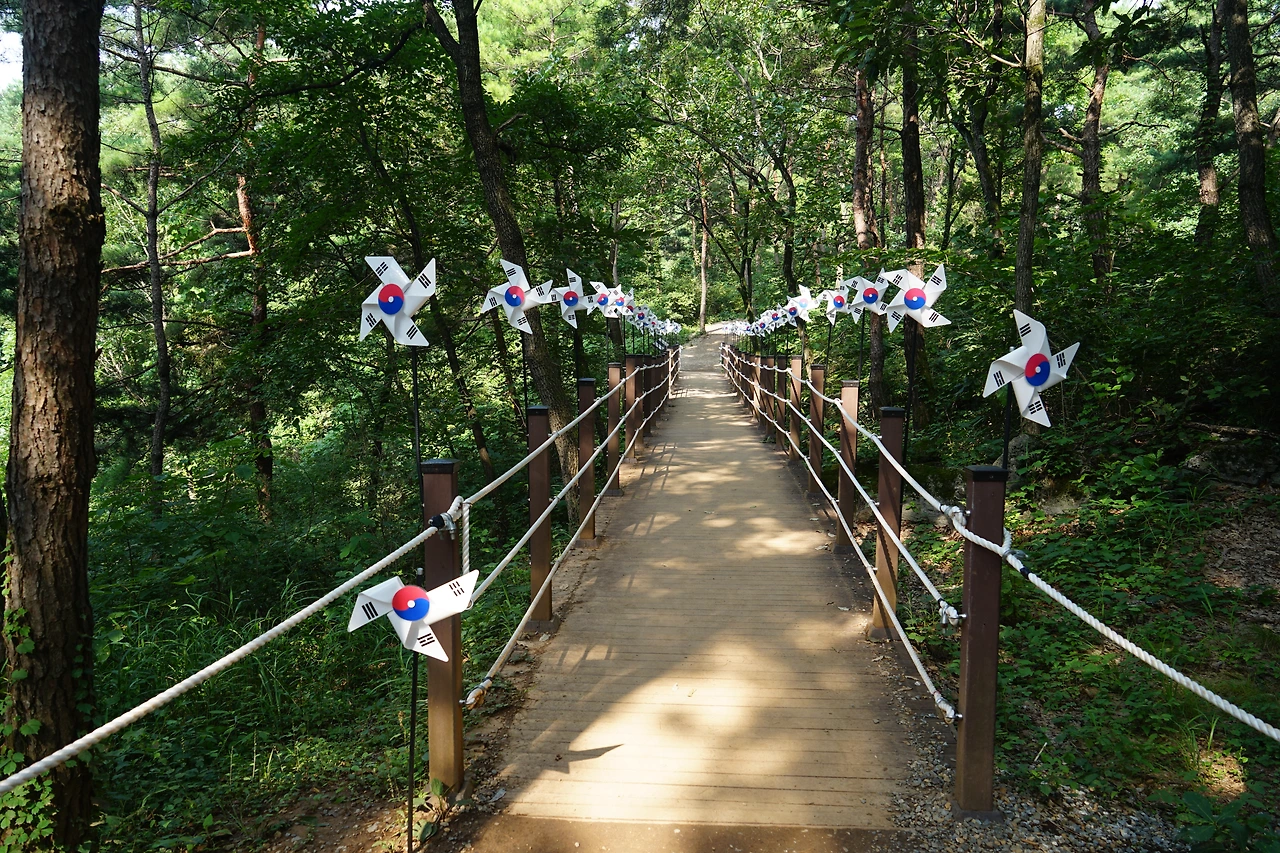 별로 손대지 않은 자연의 소나무가 반겨주는 산길을 걷다 안내판도 만나고 방향판도 만나고 작은 나무다리 길 양옆으로 줄지은 바람개비의 인사에 마냥 동심의 미소를 채우며 싱그러운 산 길을 한참 걷다 보니 전망대가
