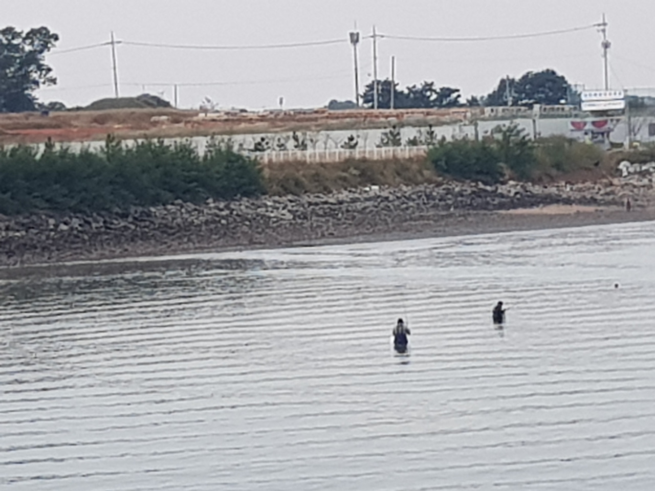 좀 떨어진 곳에는 고기잡이배 무리지어 떠있는데 가까이 바닷속에 낚시꾼들