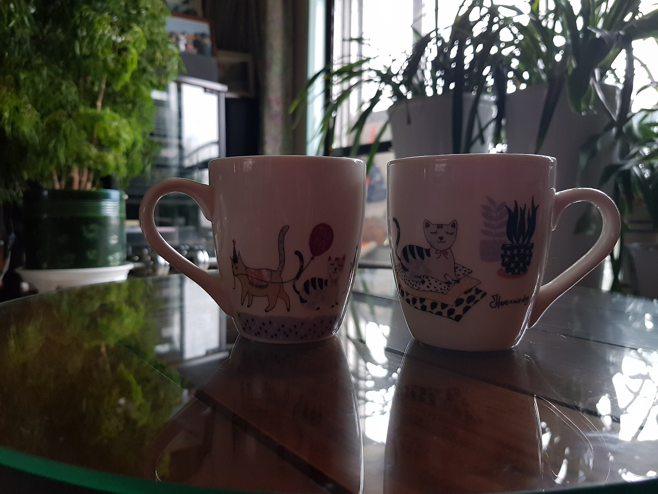 탁자에는 하얀 찻잔 두개가 놓여있다