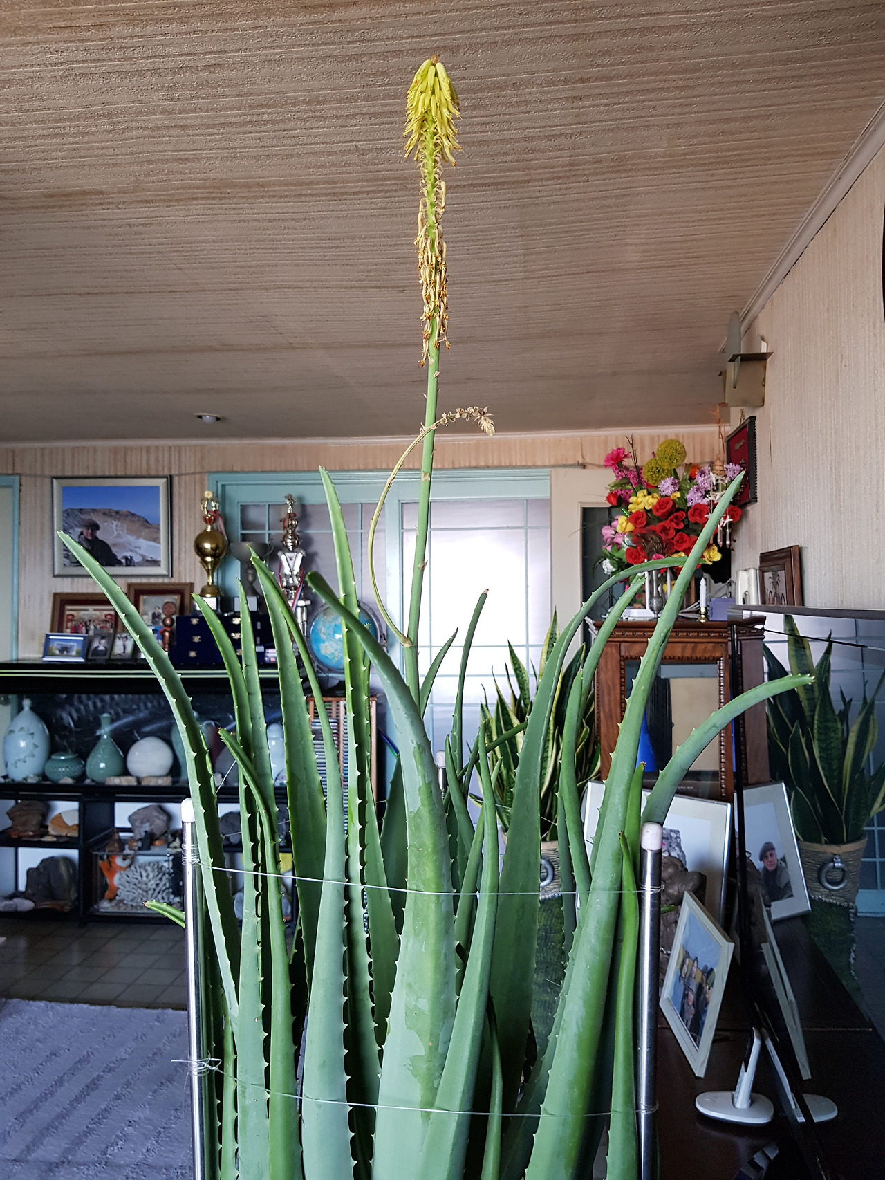 거실에 서있는 알로에 베라 꽃을 보라 한다