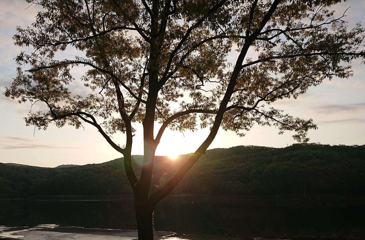 산등성이에 걸터앉아 나뭇가지 사이로