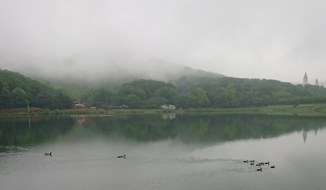 보슬비 내리는 이른 아침 호수