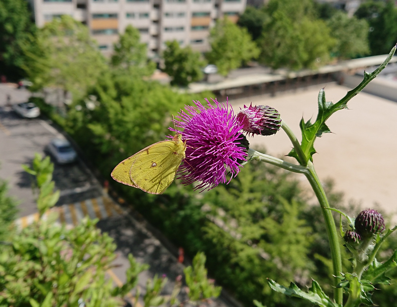 발코니 엉겅퀴 꽃에 나비 한 마리
