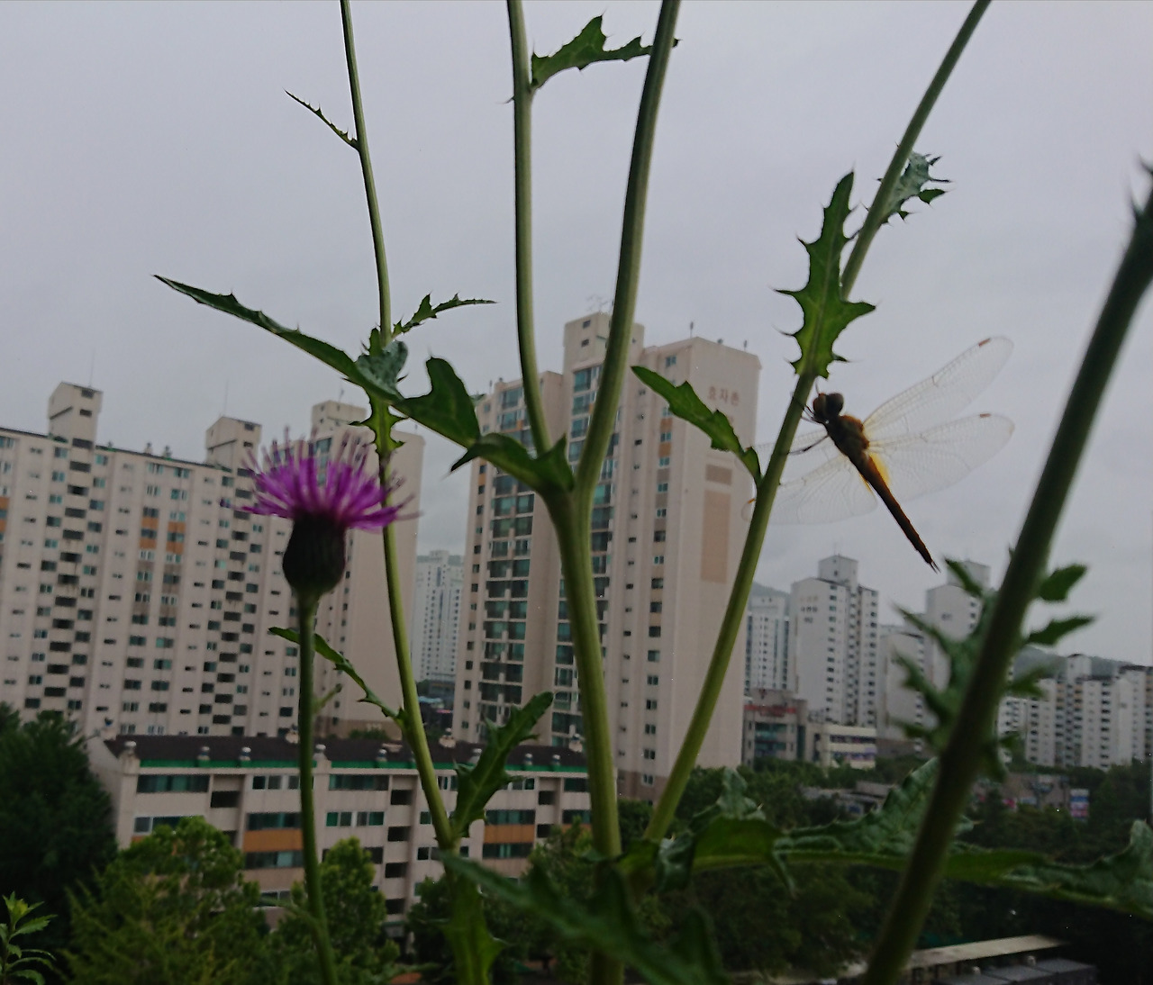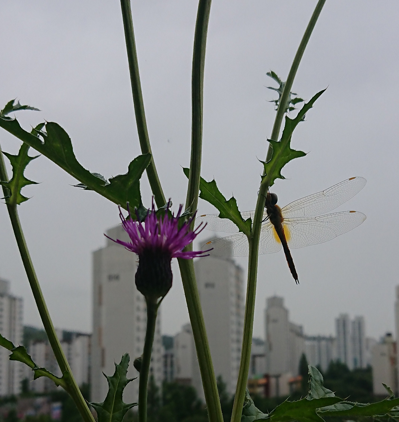 엉겅퀴꽃 인사에 바짝 올라간 꼬리
