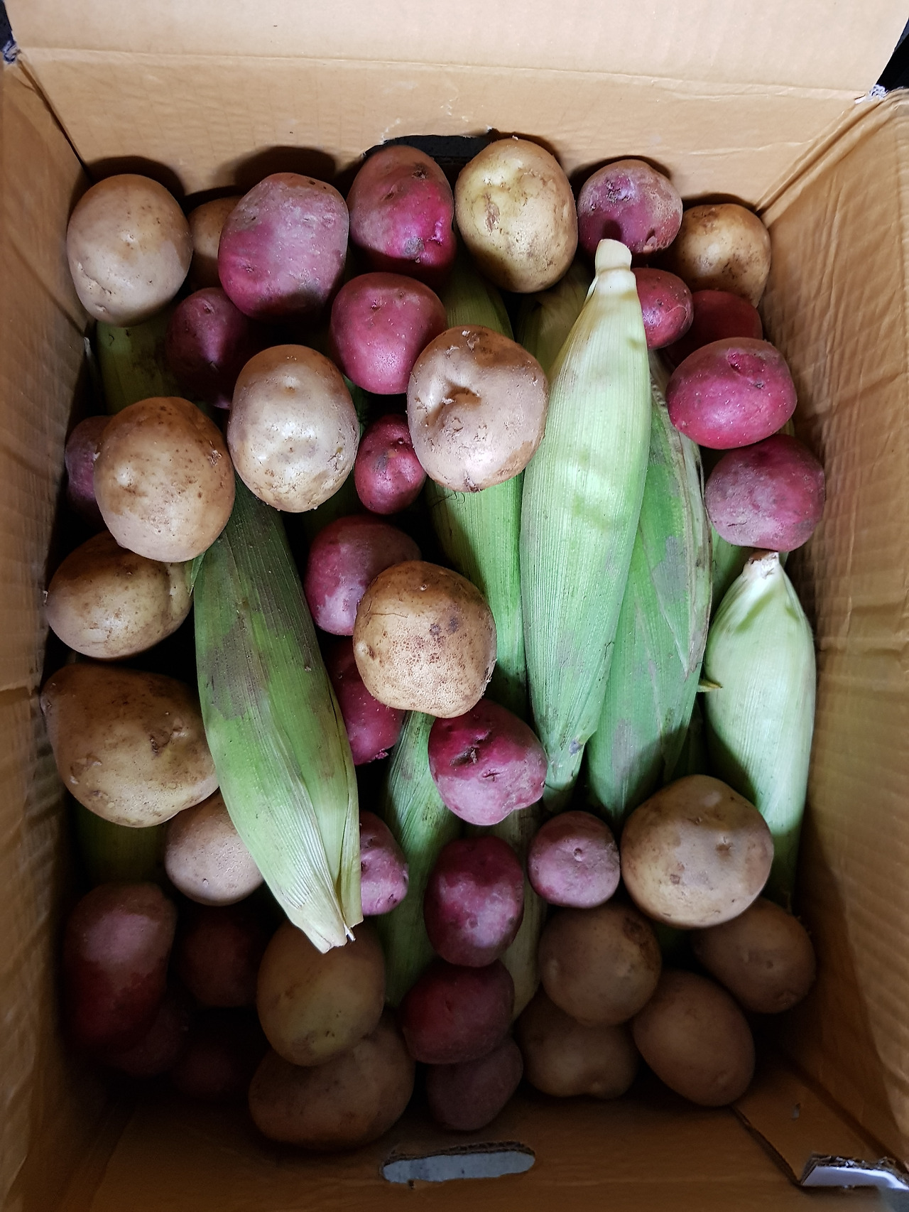 이 큰 박스에 옥수수랑 감자로 가득ㅡ