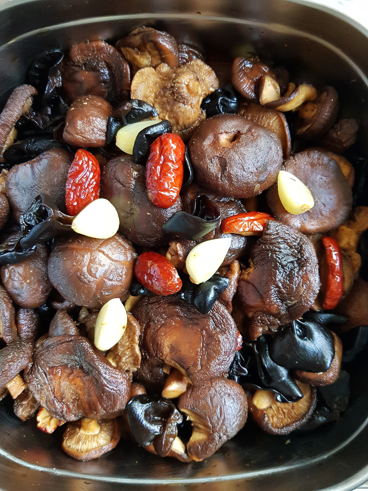 ㅡ소쿠리채 다시 여러 번 털어내고 절대로 물에 씻지 말라는 주의 사항을 지켜 버섯을 용기에 담고 깐 마늘과 대추를 씨 빼고 썰어 함께 넣었다