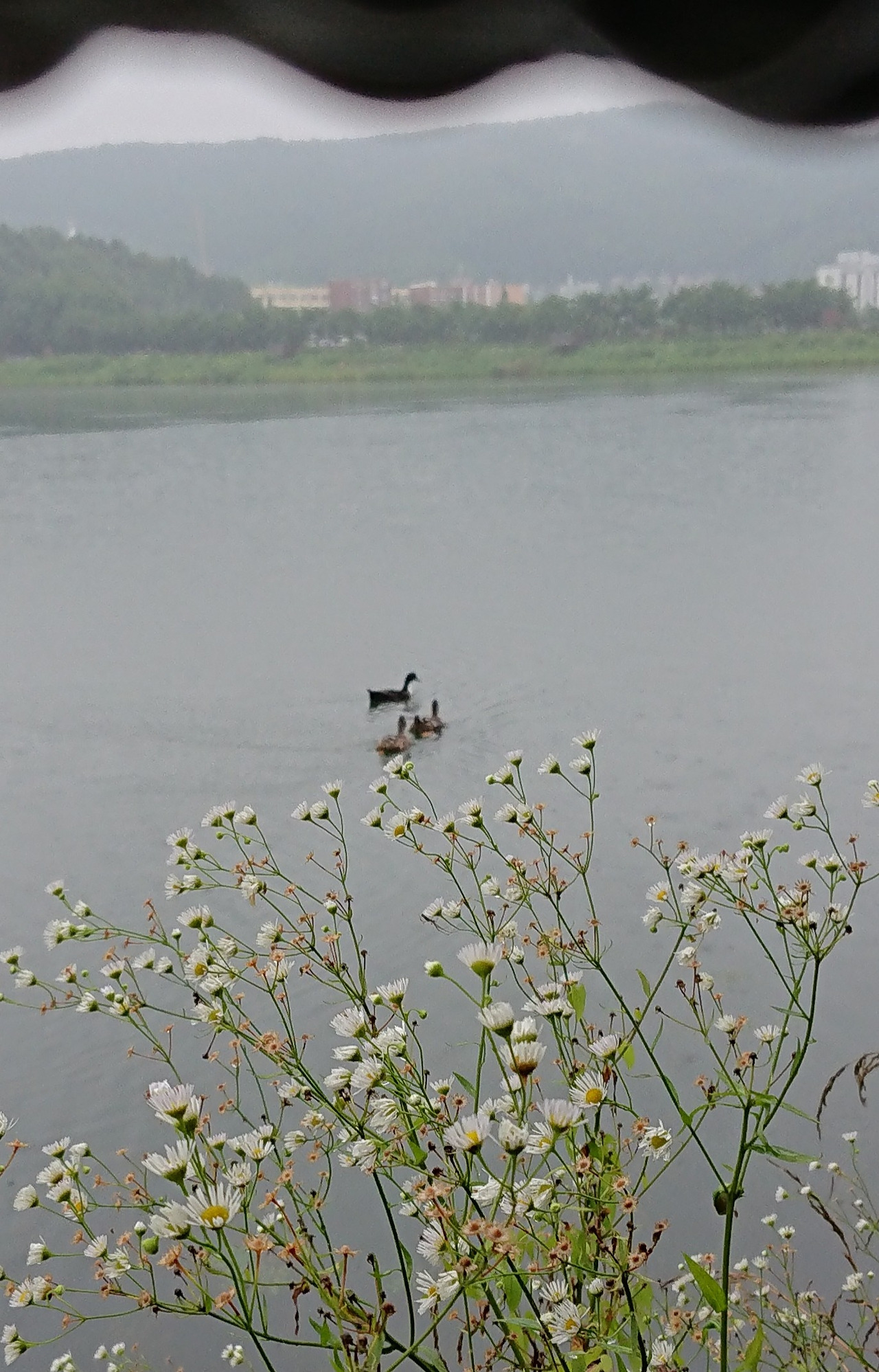 비 오는 날의 호수의 아침.