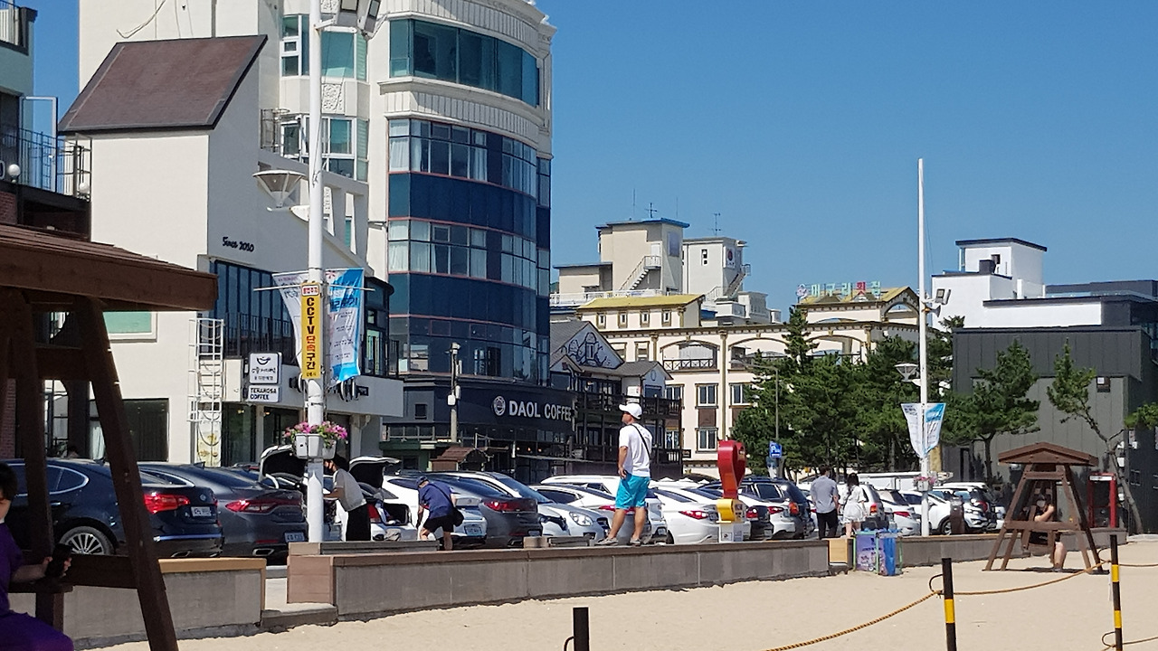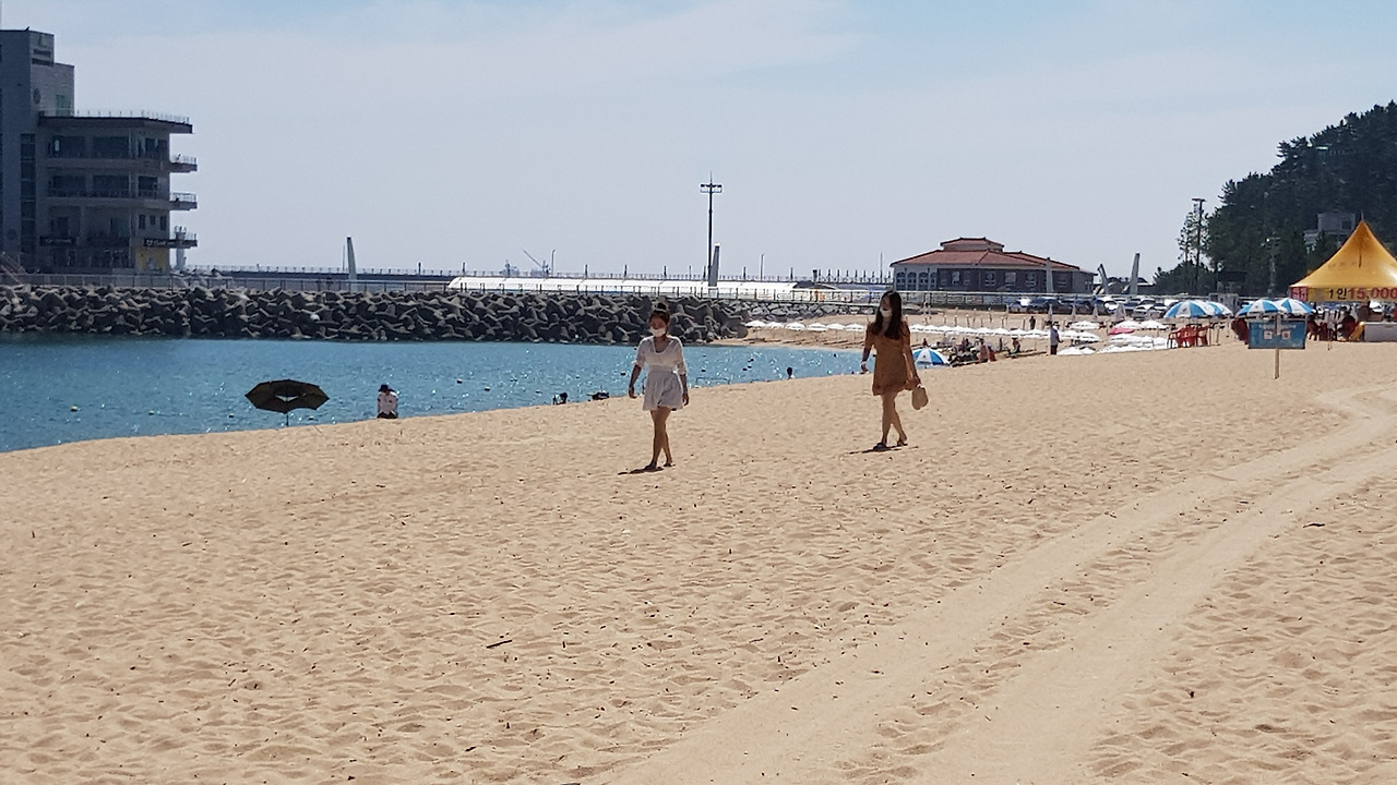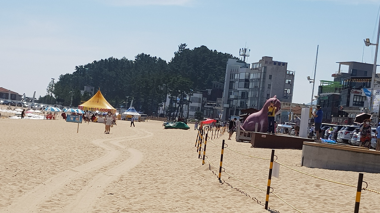 깨끗하고 커다란 백사장에는 금모래가 반짝이고 바닷가 쪽으로 하얀 파라솔이 달리기 하듯 줄을 맞춰 서 있다