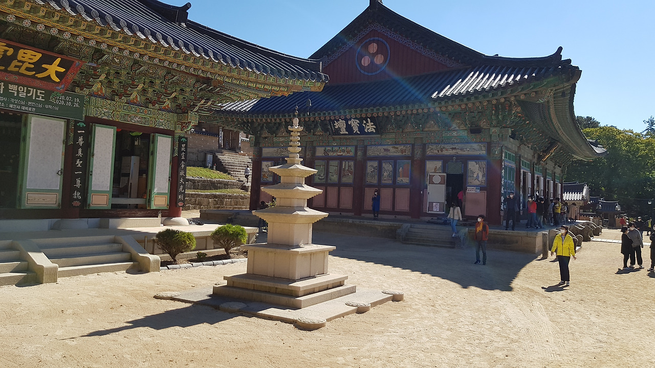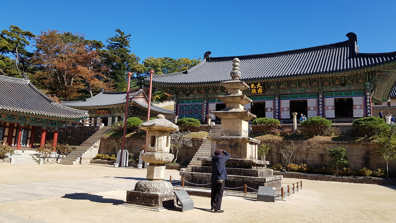 고사목과의 애끓는 인사를 마치고 홍류문을 지나고 또다시 산문 안으로 들어서자 넓은 마당이 펼쳐지고 중심에는 대웅전에 마주 선 석탑과 석등이 자리하며 범종과 법고 어고 가 위치한 건물과 빙 둘러선 건물들이 그 위용을 자랑하며 위쪽 중심에 당당하게 서있는 대웅전을 호위하고 있는 듯했다