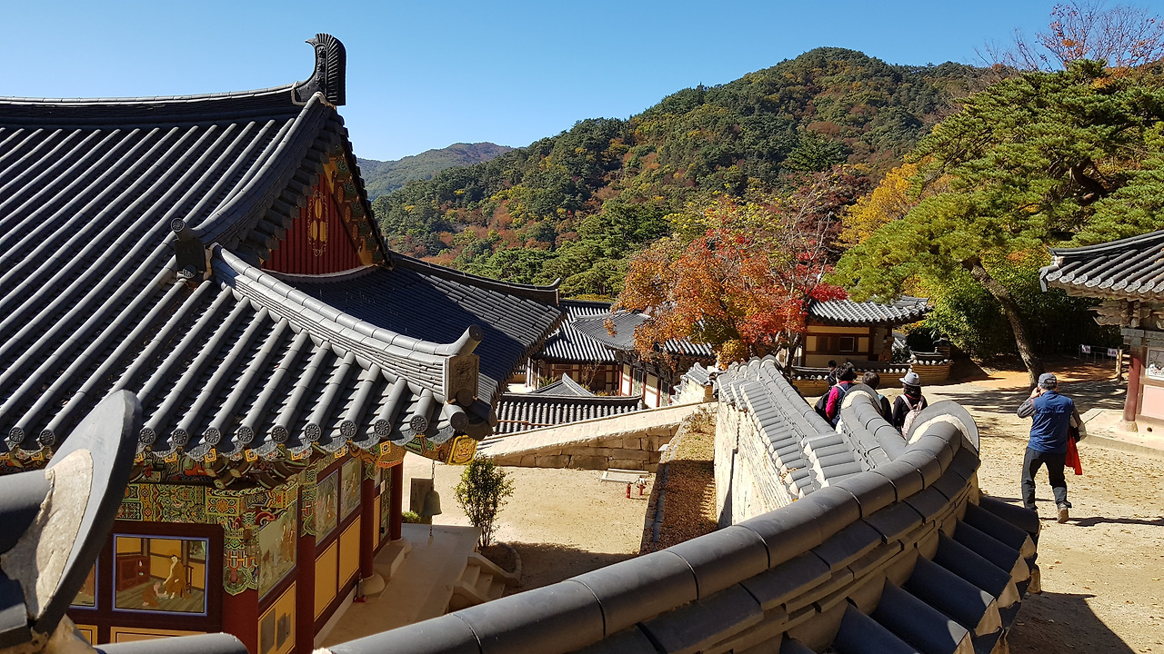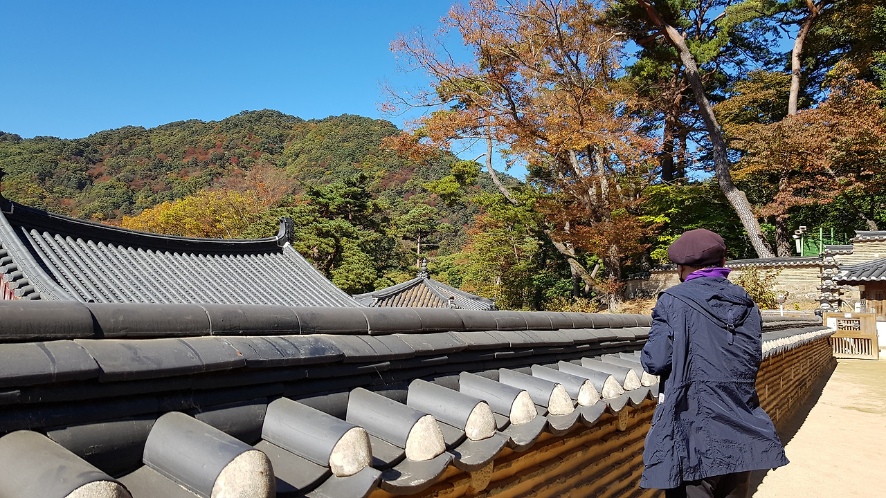 파란 가을 하늘과 조화를 이룬 알록달록한 자연 그리고 더 멋스러운 우리의 건축 양식인 기와의 선들이 어우러져 우리의 자연이, 우리의 건축양식이, 우리의 것이 얼마나 아름다운지를 가슴 깊이 담으며 감상에 젖어 있는데 법고 소리가 우렁차게 들려 내려가 보니 많은 사람들이 스님의 법고 연주에 매료되어 있었다