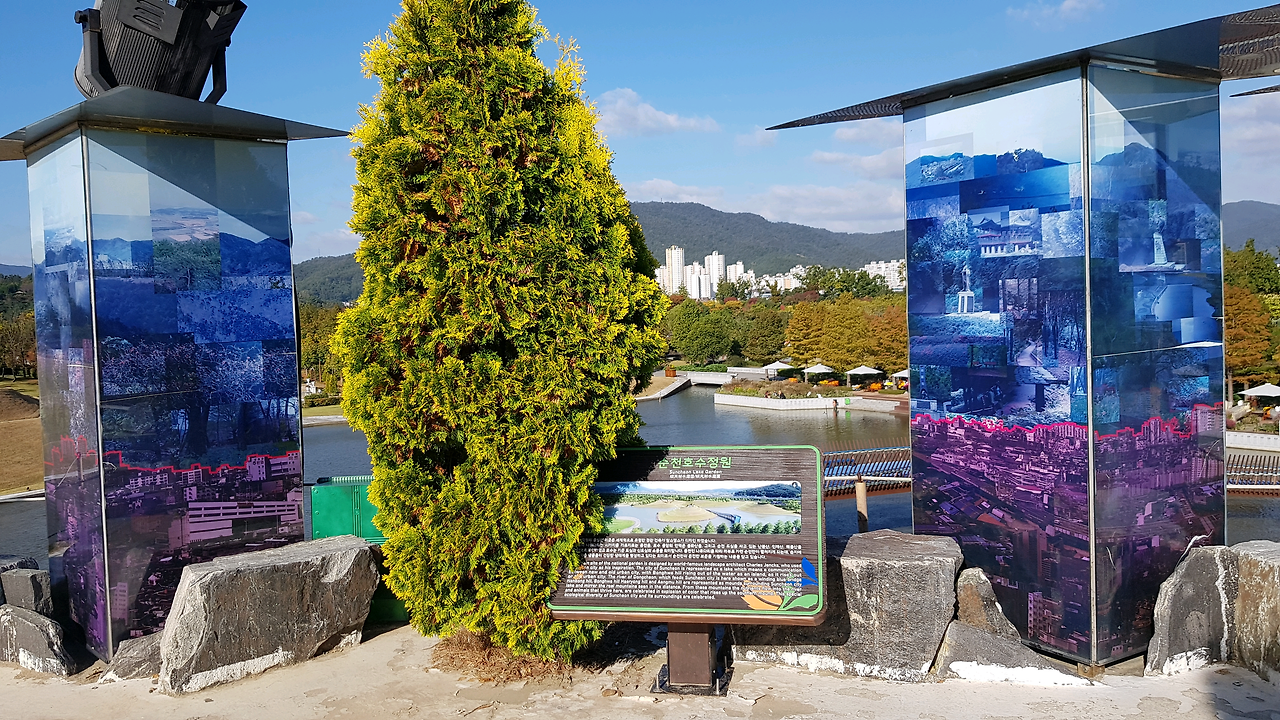 코스 안내를 보며 그 곁을 돌아 드디어 똥산에 오르기 위해 다리로 향했는데 호수를 통과하는 다리는 여러개의 똥산을 연결하고 있었고 기억나지 않는 이름도 제각각인 똑 같은 모양의 똥산에 오르면 정상에는 하나같이 초 현대식의 사각 기둥에 사진과 설명을 실어 놓았다