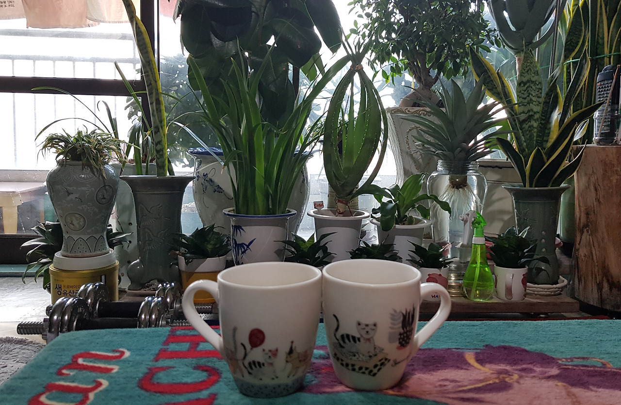 부지런히 마무리를 하여 침대에 깔아놓고 나오니 거실 탁자에 나란히 있는 두 잔의 커피