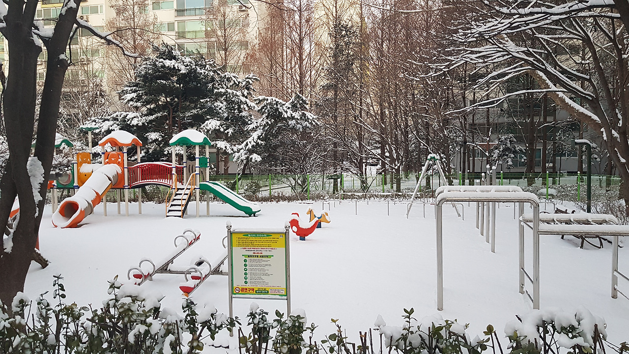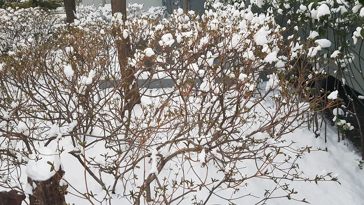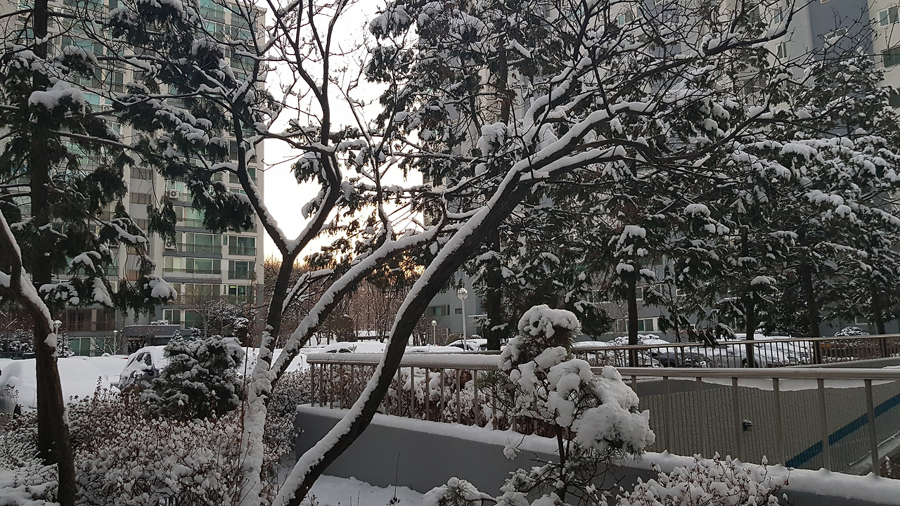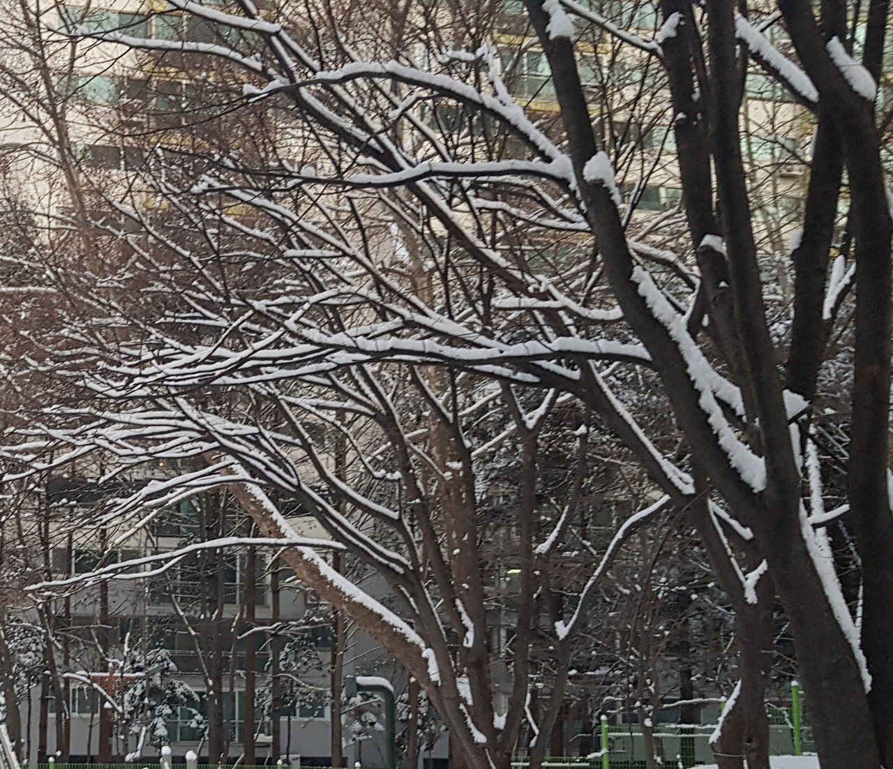 초록의 잎새들은 눈꽃 단장 곱게 하고