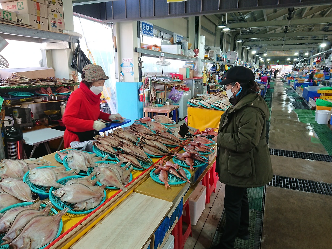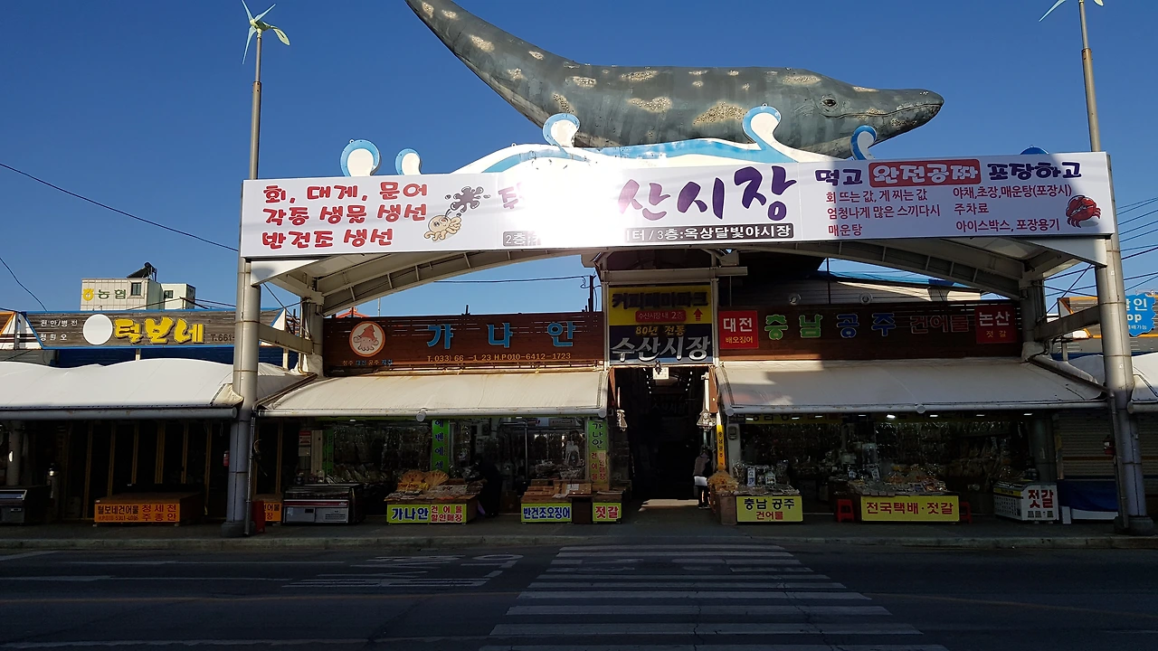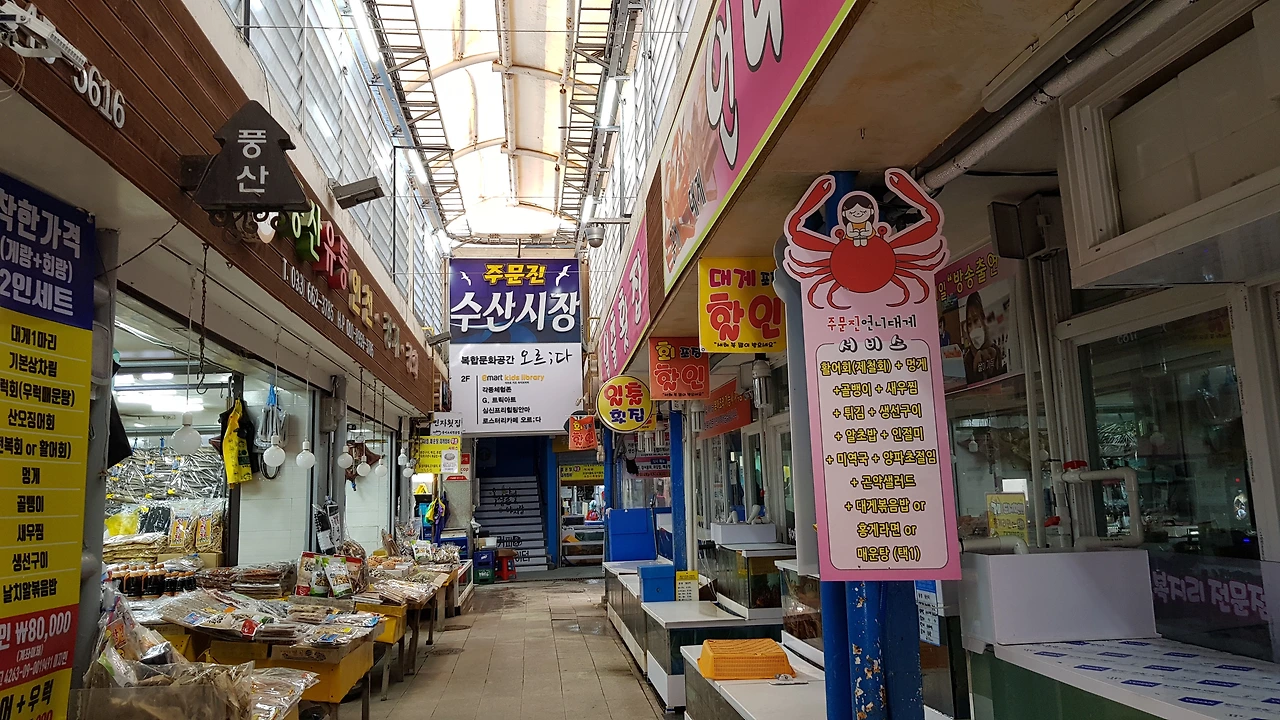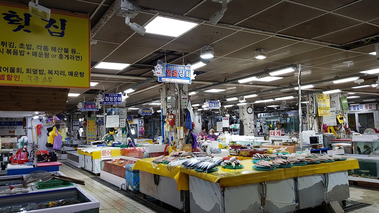 많은 생선들이 넘치고 꾸득꾸득 말린 반건조 생선가게와 맛있는 젓갈, 각종 생선들이 팔딱거리고 상인들의 표정도 열정이 넘치고 있었다