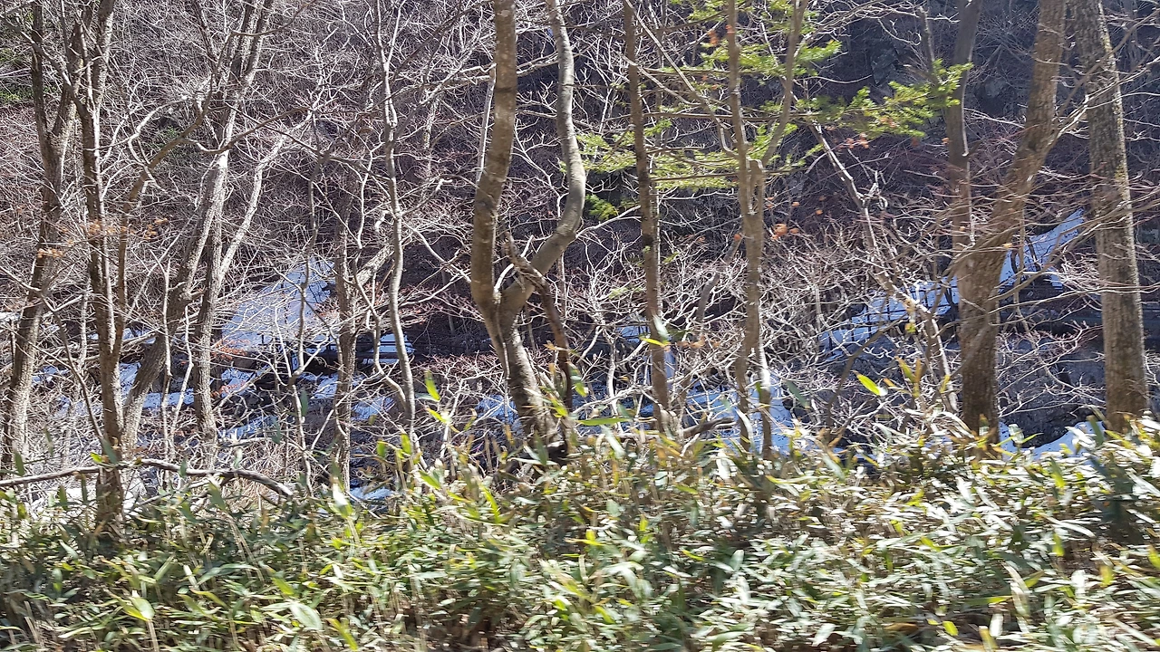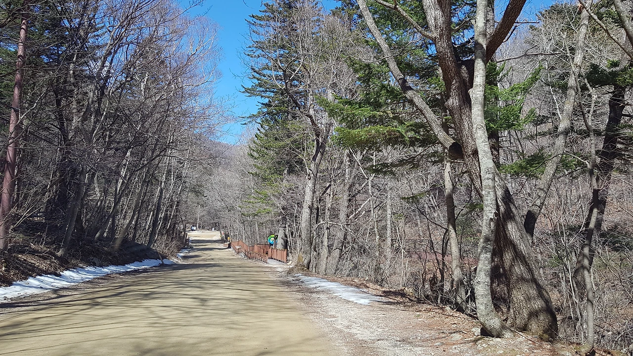 아직도 길가와 계곡에 하얀 눈이 반기는 추억을 가져오는 신기하고 아름다운 신작로