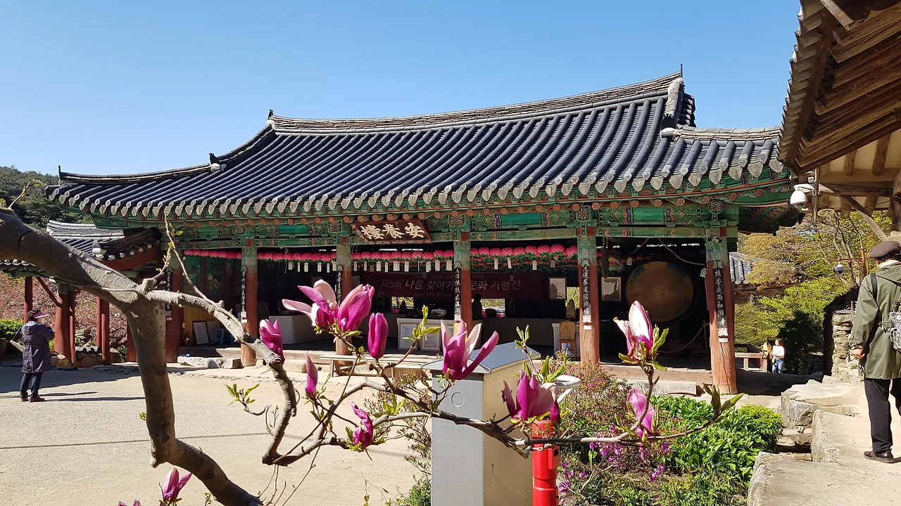 마당 중앙에는 5층 석탑이 있었고 작은 키의 자목련이 예쁘게 피어 풍경을 더 아름답게 관람객의 눈길을 사로잡고 있었다
