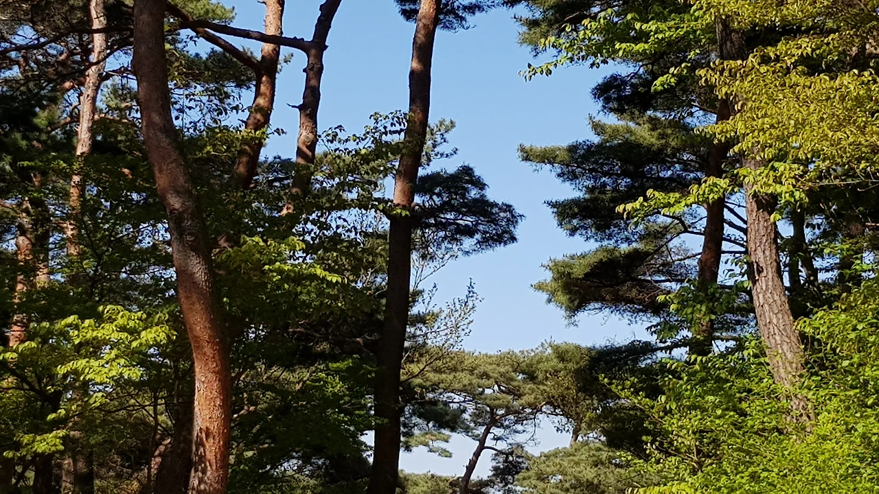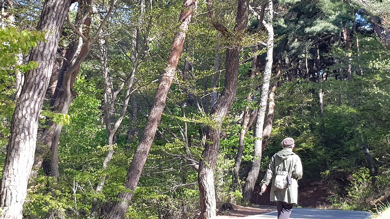 그 길은 붉은 소나무가 우거진 숲길 사이로 난 차도였는데 울창하고 짙푸른 노송 숲과 여기저기 피어있는 봄 꽃을 만나며 자연에 취해 콧노래가 절로 나왔고