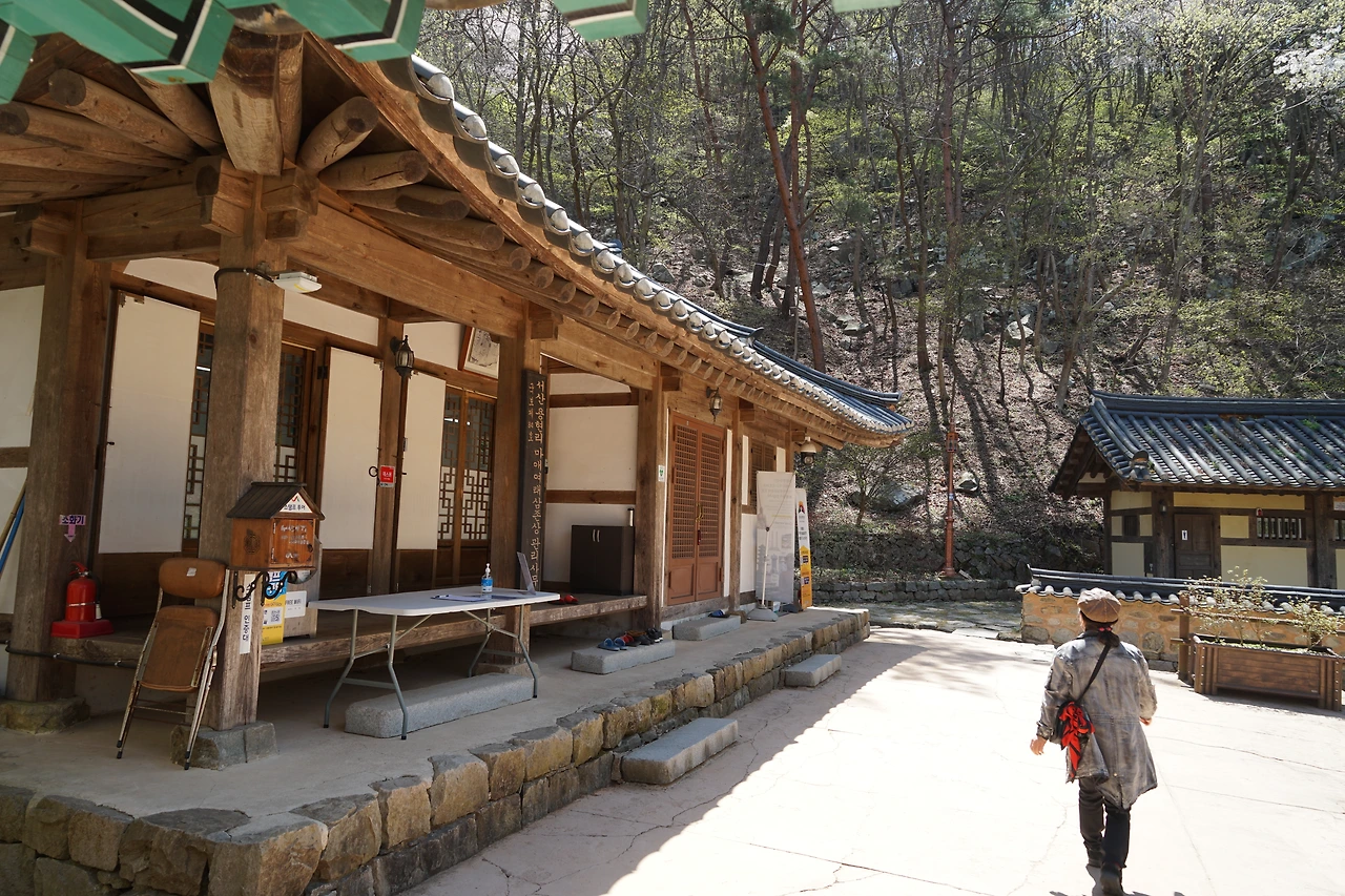 예전에는 이 처럼 다리가 없고 물을 건너 숲길을 따라 올라갔었는데 다리를 건너 계단을 올라가니 작은 암자인가? 했는데 마애 여래 삼존불의 관리실이었다