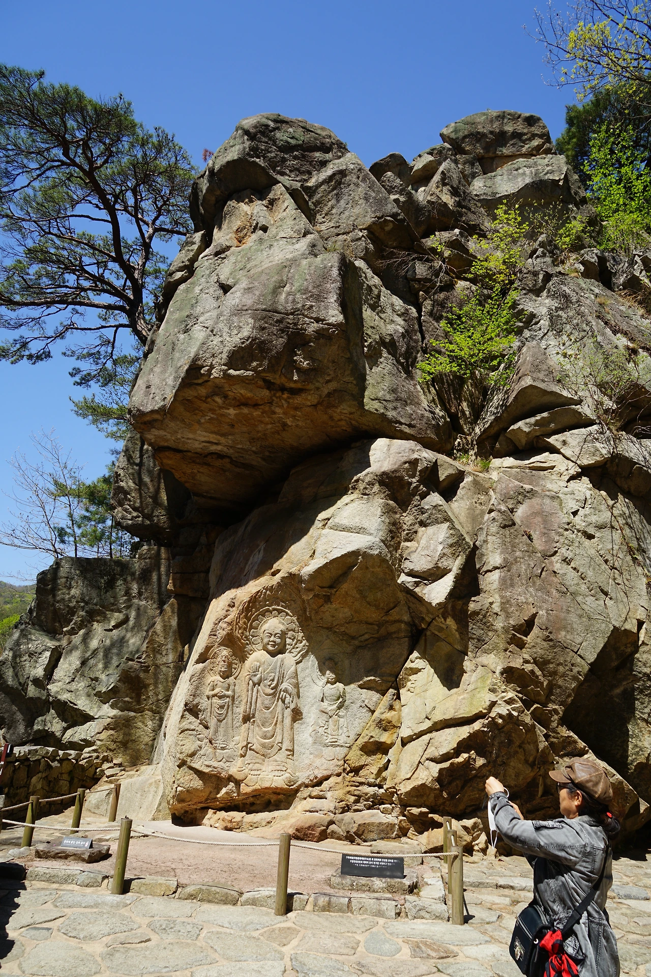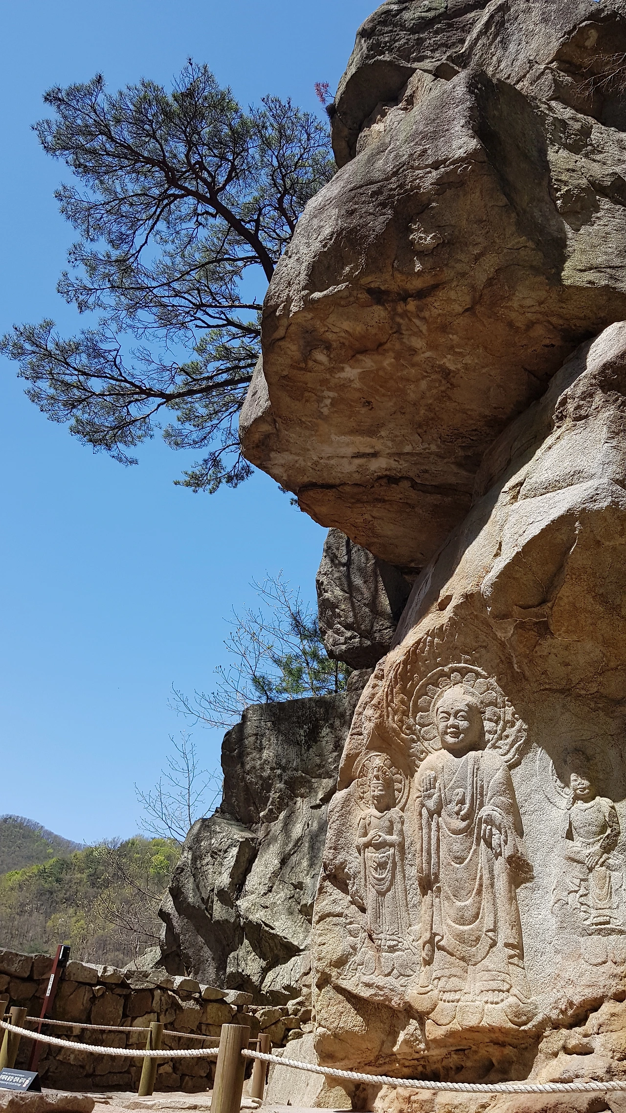 돌로 조성된 계단을 올라 관리실을 통과해 조금 더 오르니 마애 여래 삼존불 앞에 도착했다