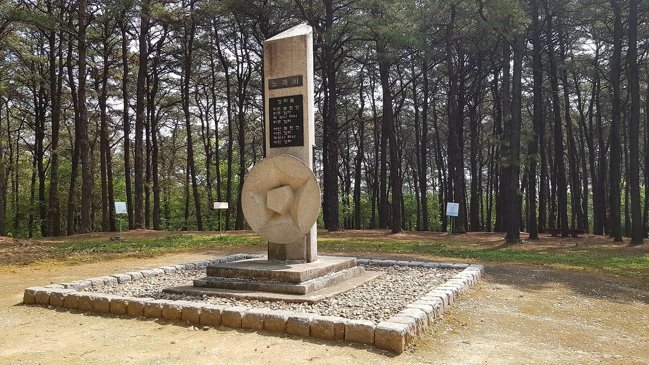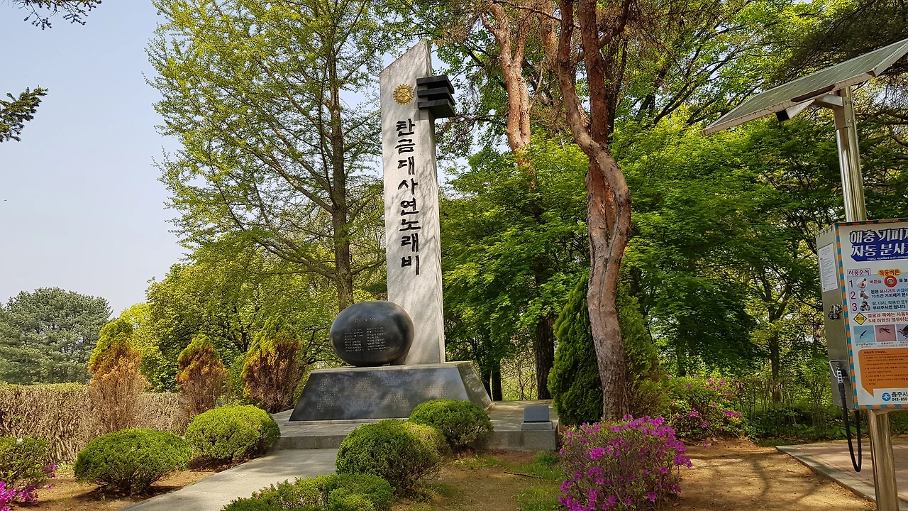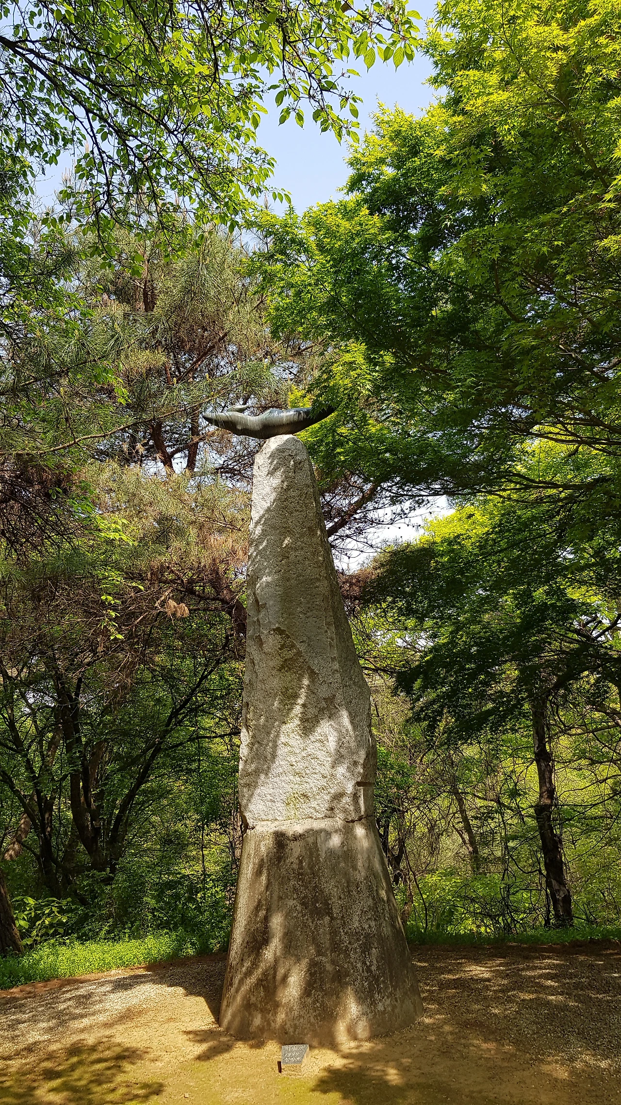 기대와 달리 주차장 바로 앞에 야외 음악당이 넓은 잔디광장에 있었고 산책길로 들어서자 노래비와 줄이어 여러 조각 작품들이 설치되어 있었다.