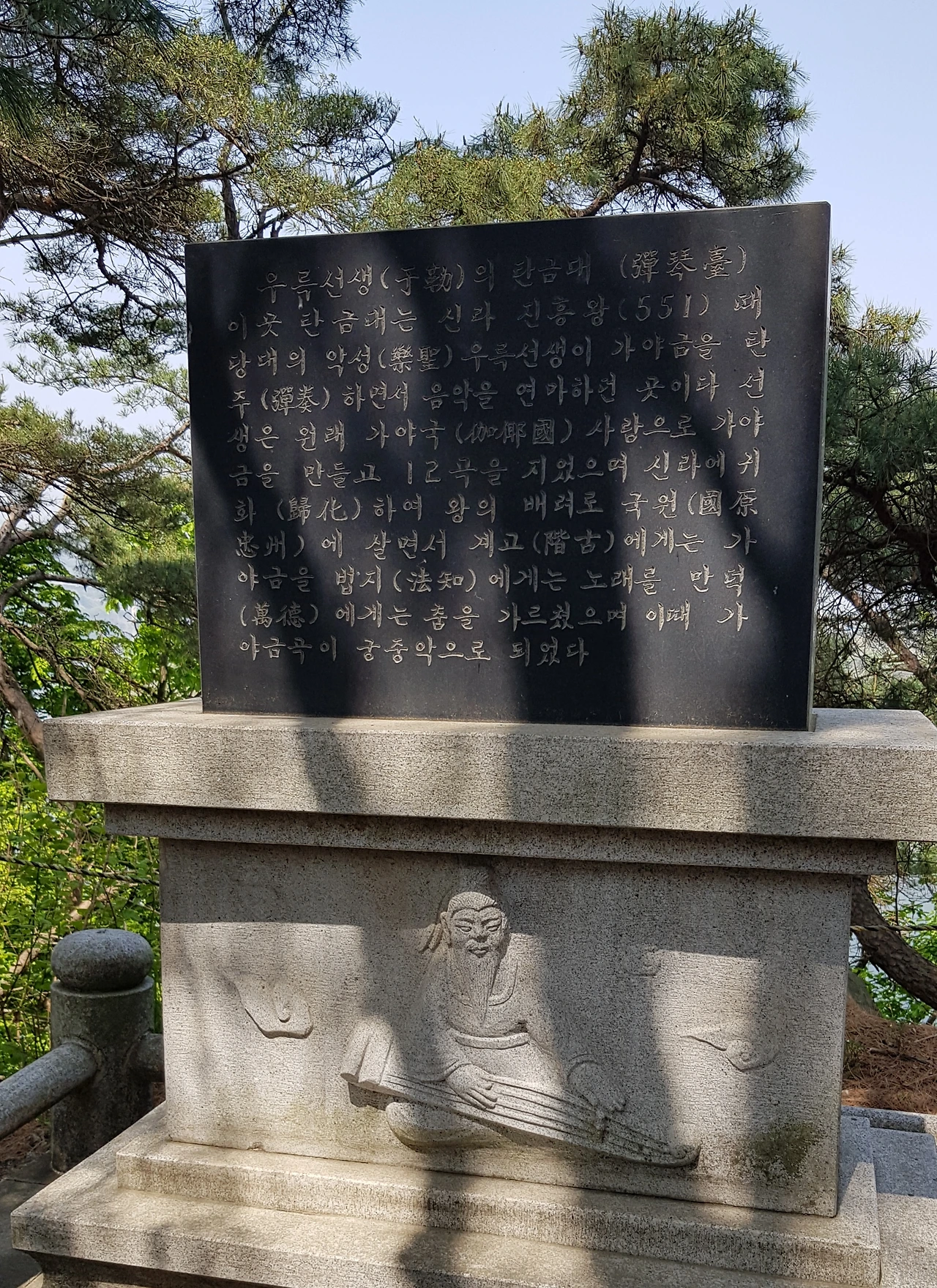 열두대 옆에는 역사를 새긴 돌비가 있어 바라보다가 어쩔 수 없이 죽음을 택할 때 장군의 마음이 어땠을까 라는 안타까움으로 열두대를 나와 탄금정에 올라 잠시 경치를 감상하고 곁길로 들어섰는데 지금껏 찾던 탄금대의 주인에 관한 기록을 담은 검은 돌비가 있었고 그 돌비를 우륵이 거문고를 타는 모습으로 받치고 있었다.