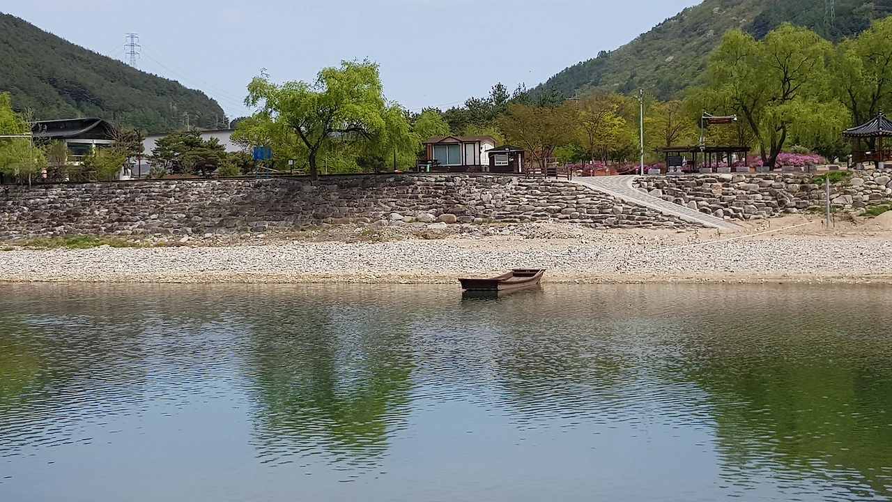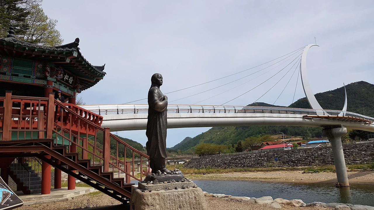 비 옆에는 여송정 정자와 정자 앞에 기다림이 배어있는 듯한 애절한 느낌의 처녀상이 있어서 처녀상을 가까이 보려 계단을 내려가니 송천의 징검다리가 정겹게 놓여 있었는데 강 건너 나룻배와 너무도 잘 어우러져 한 폭의 산수화를 보는 듯했다.