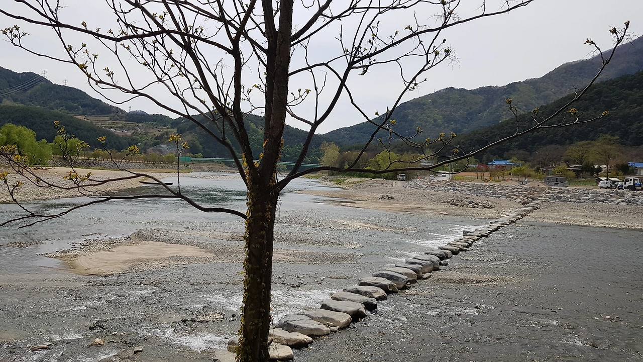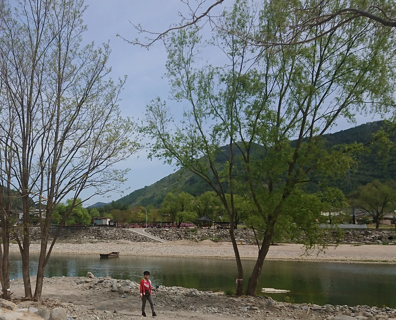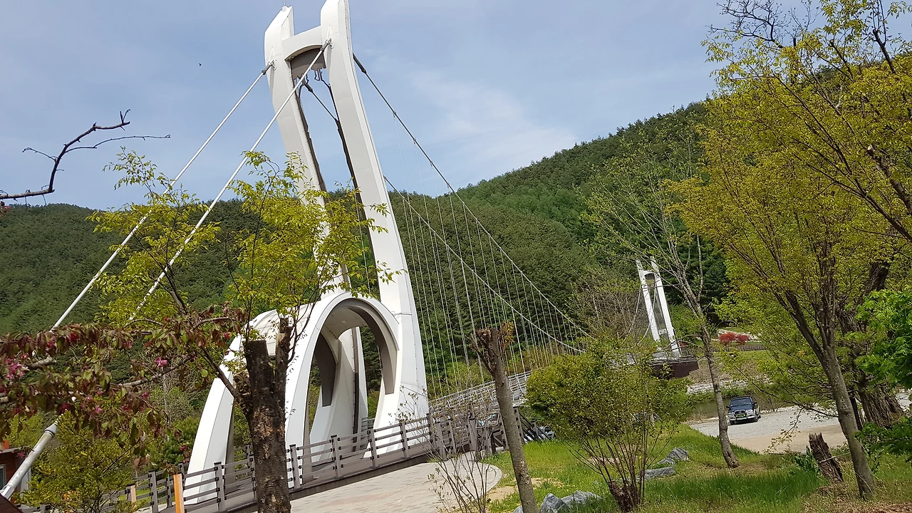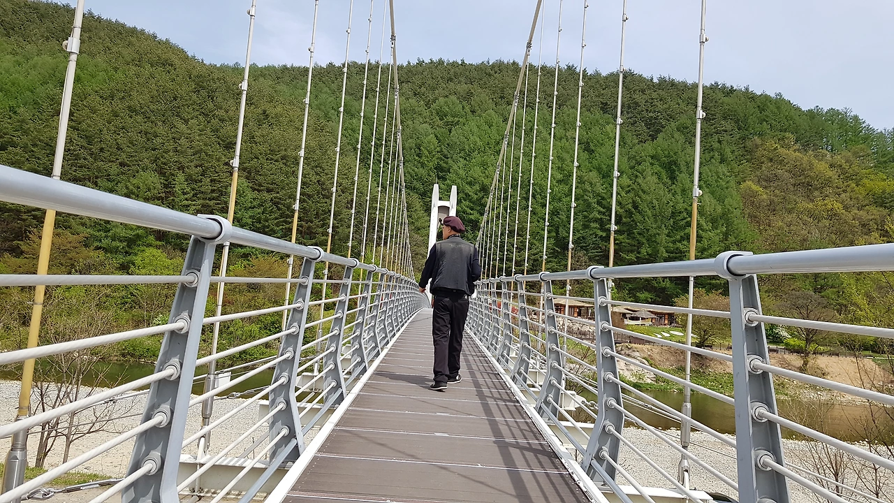 복원 작업이 한창이어서 길가에 주차 후 강가로 내려가 강 건너에 매어 있는 나룻배를 한컷 담고 나오려다 작업구간을 지나 강을 건너는 아름다운 다리가있어 가보니 송천을 가로지르는 출렁다리였다.