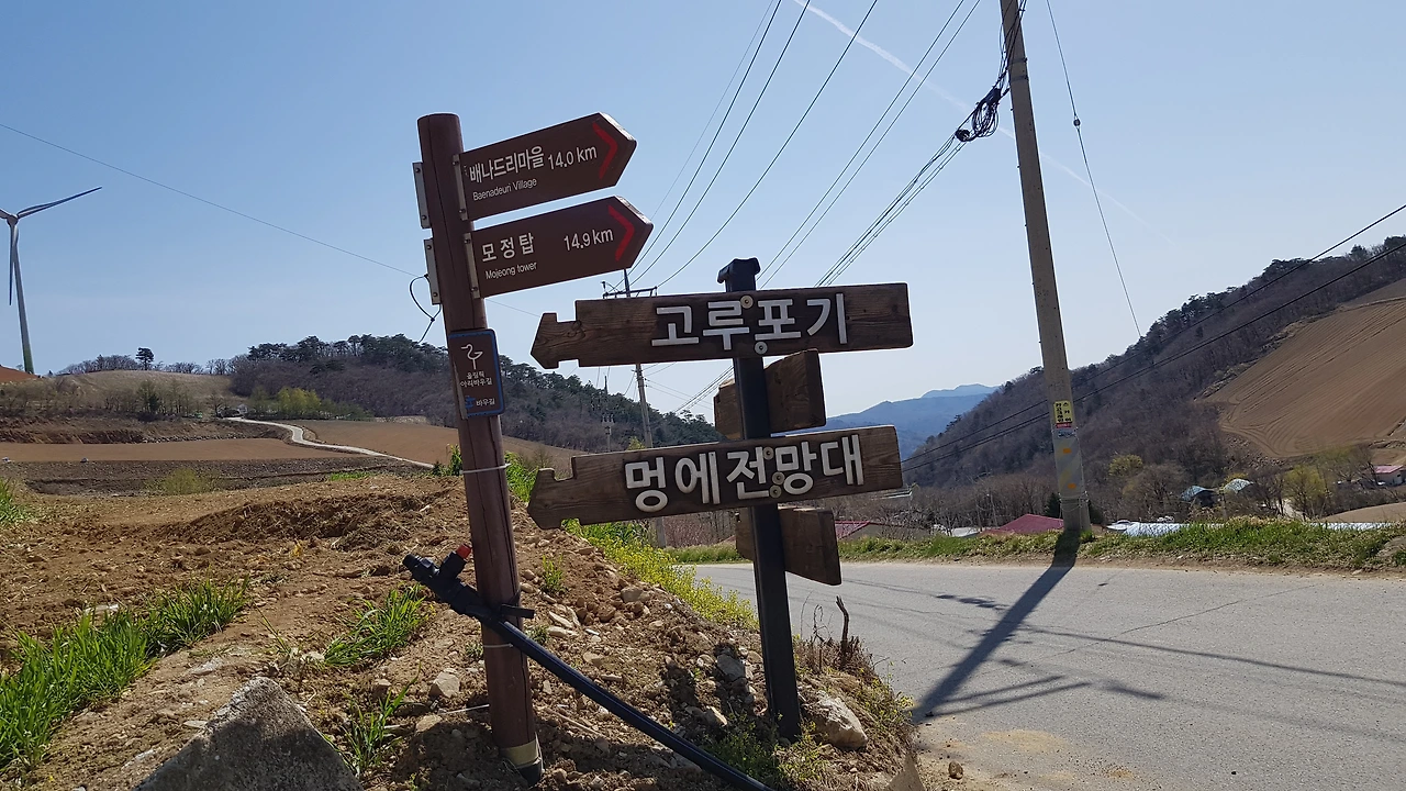 코스를 잡기 위해 이정표를 보니 멍에전망대의 화살표와 차량 출입 금지의 푯말이 서 있었다