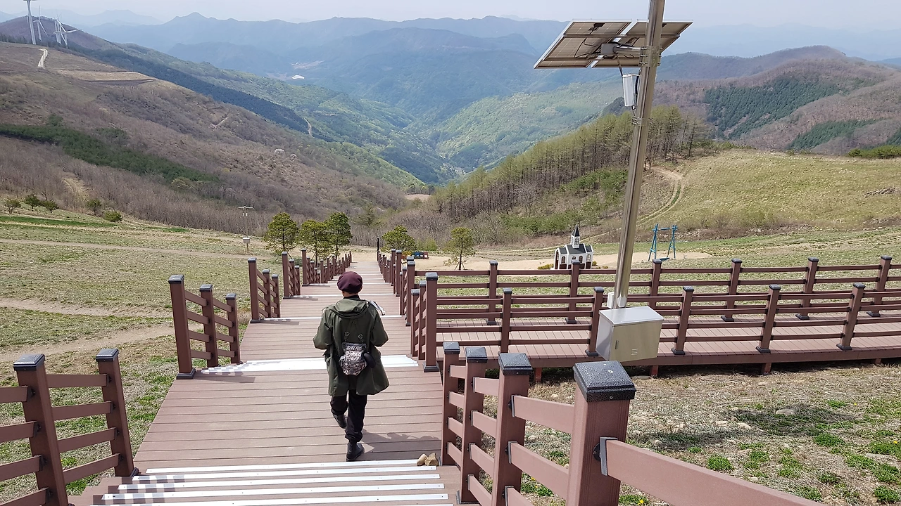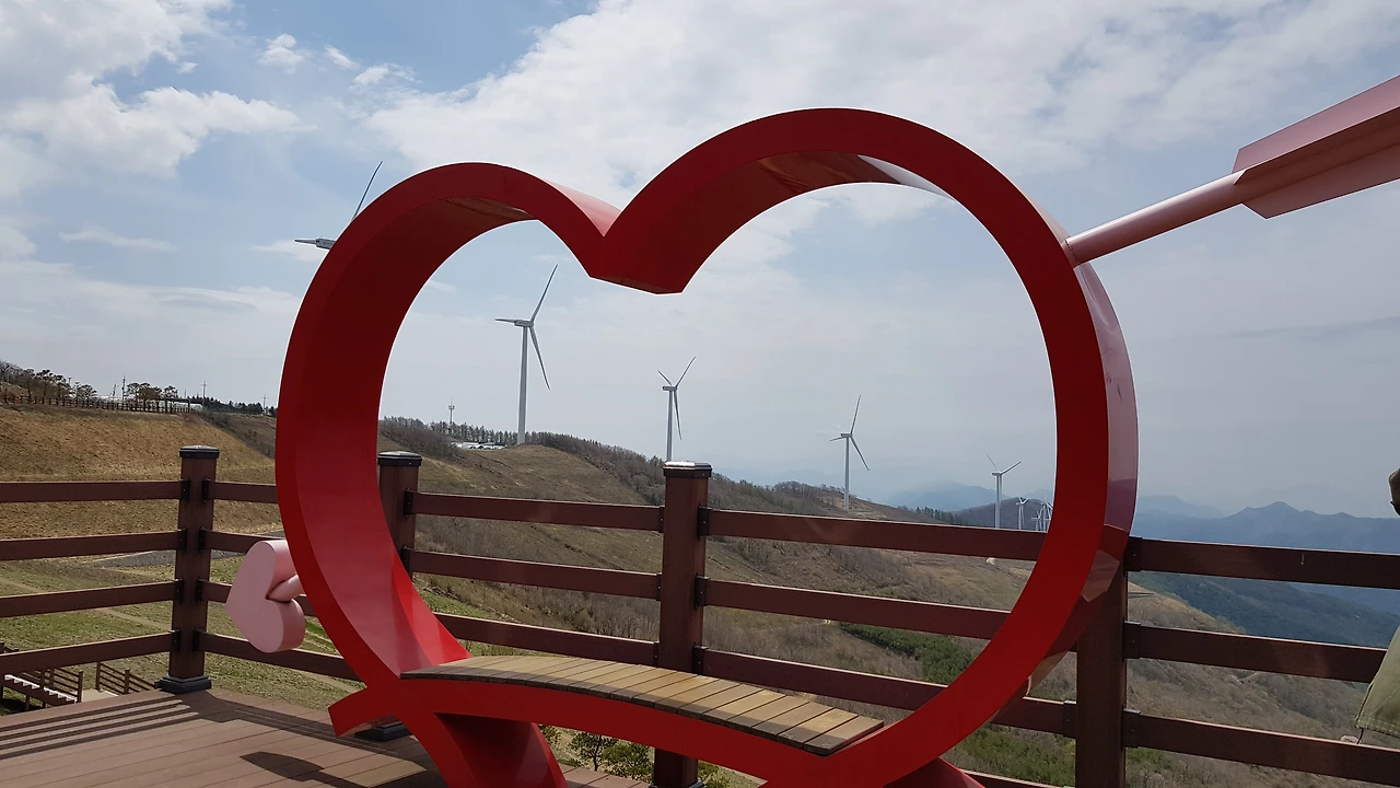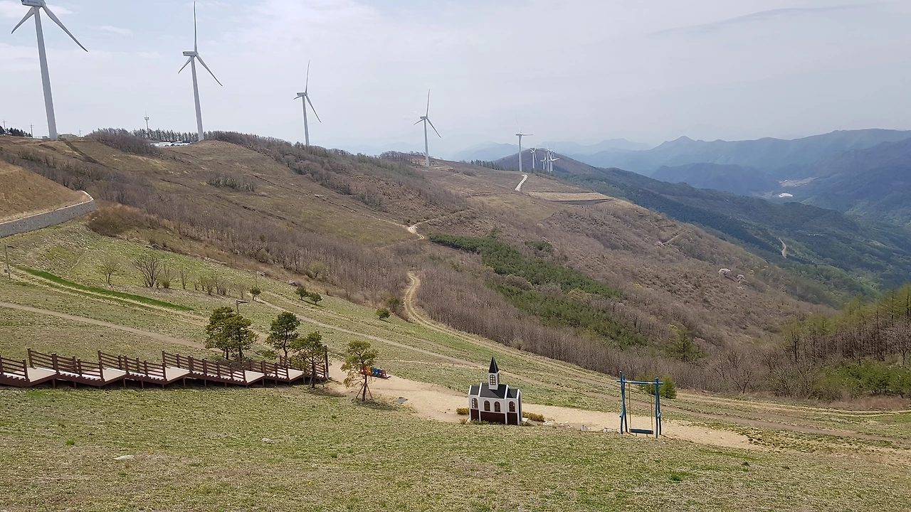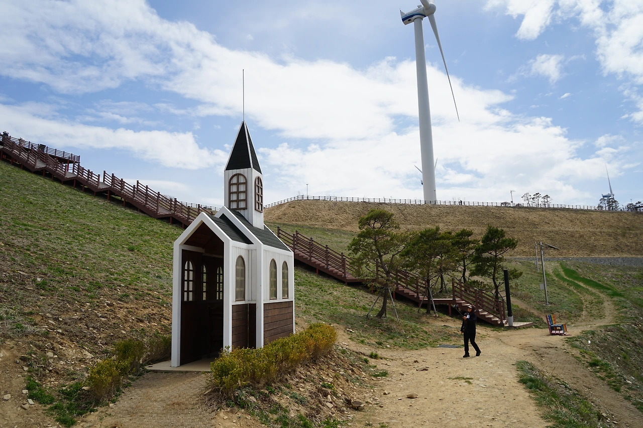넓은 육백마지기의 터에 하얀 교회와 무지개 의자 움직임을 잡아놓은 그네 저 위쪽으로 보이는 하트 그리고 나무계단은 푸른 하늘과 우람하게 돌고 있는 풍력발전기들의 줄 서기에 넋을 잃고 풍경에 푹 빠져 버렸다
