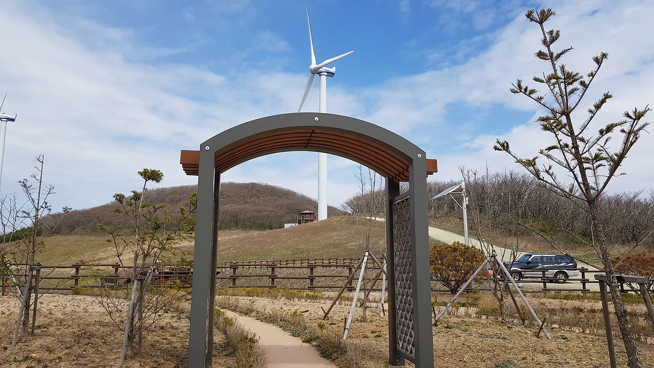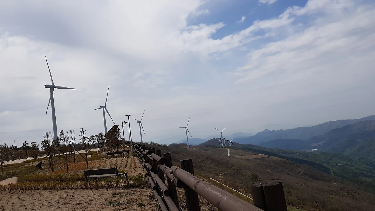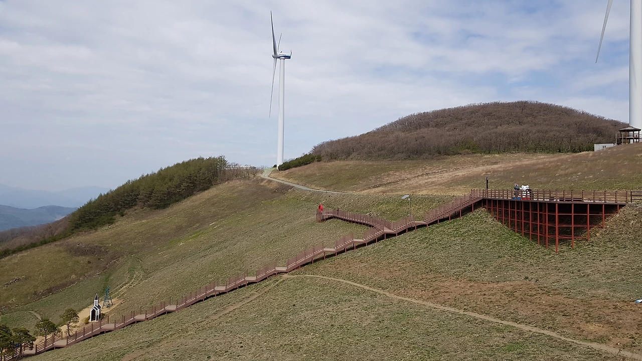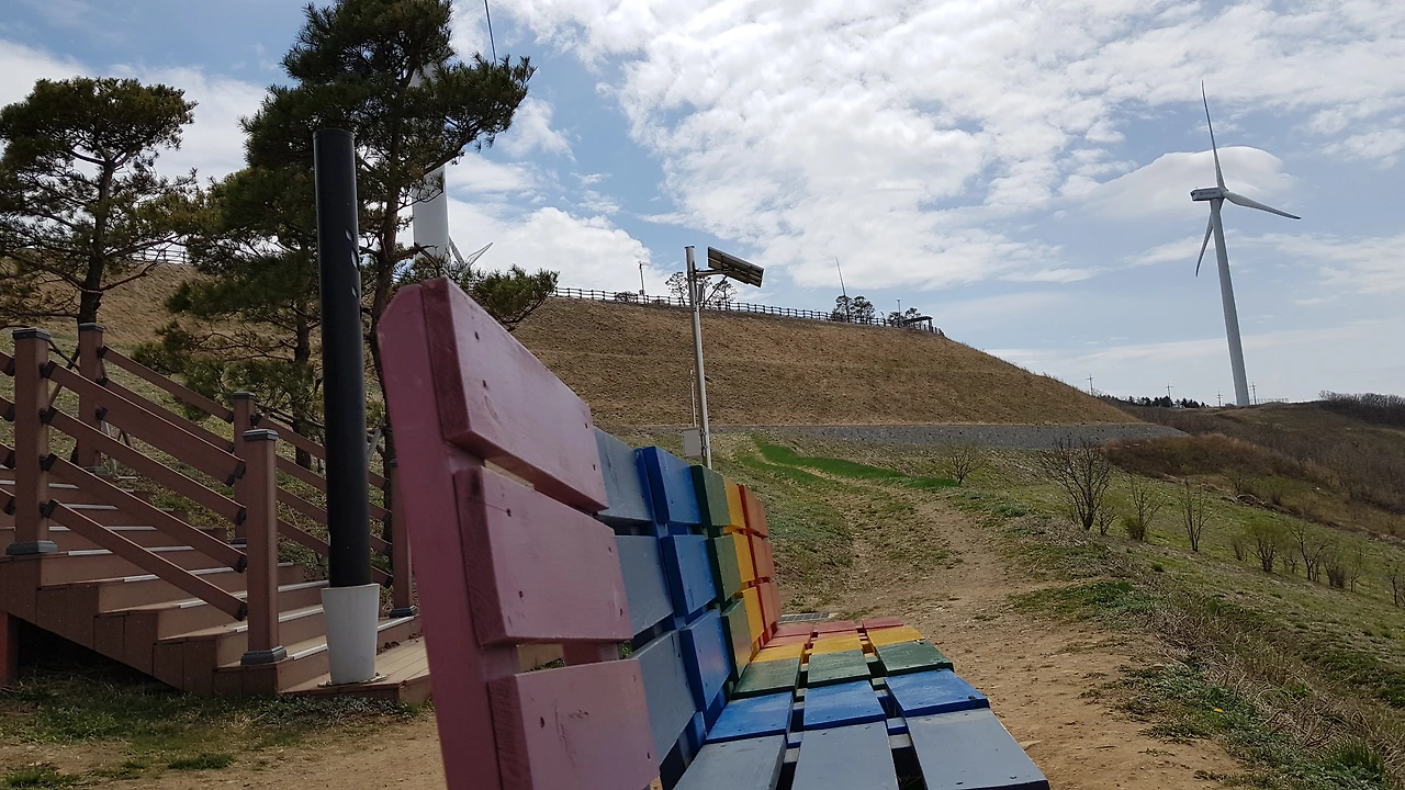 맨 위쪽의 정자에 가보니 바로 옆에서 돌고 있는 아름드리 풍력발전기가 있어 올려다보니 그 크기가 생각보다