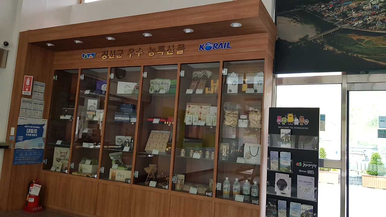입구 쪽 진열장에는 정선의 우수농산물을 소개하고 있였으며 한쪽으로 정선 열차시간표와