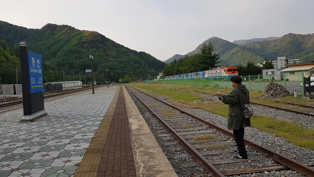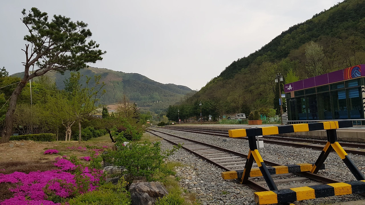 역사를 나와 철로에 서 보니 아름다운 봄꽃들이 응원가를 보내는 쭉 뻗은 철로가 우뚝 우뚝 솟아있는 산을 향해 달리고 있었고 플랫폼에는 정선이라는 하얀 간판이 아직도 나름 건재함을 과시하고 있었다.