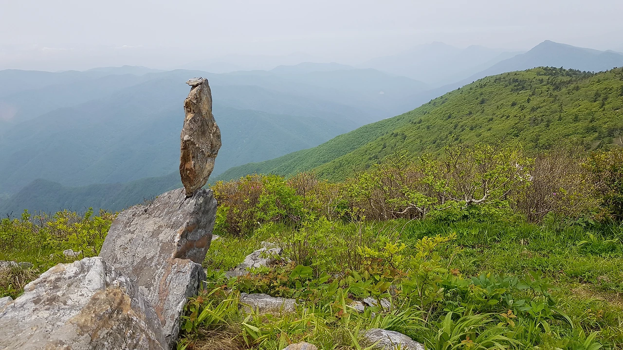 20분쯤 갔을 때 비가 쏟아졌지만 강원도에는 하루 종일 흐림이라는 일기예보를 믿고 계속 전진하였는데강원도 깊숙이 들어가자 비가 그치고 등산하기 좋은 날씨가 되었다