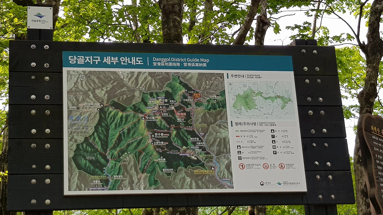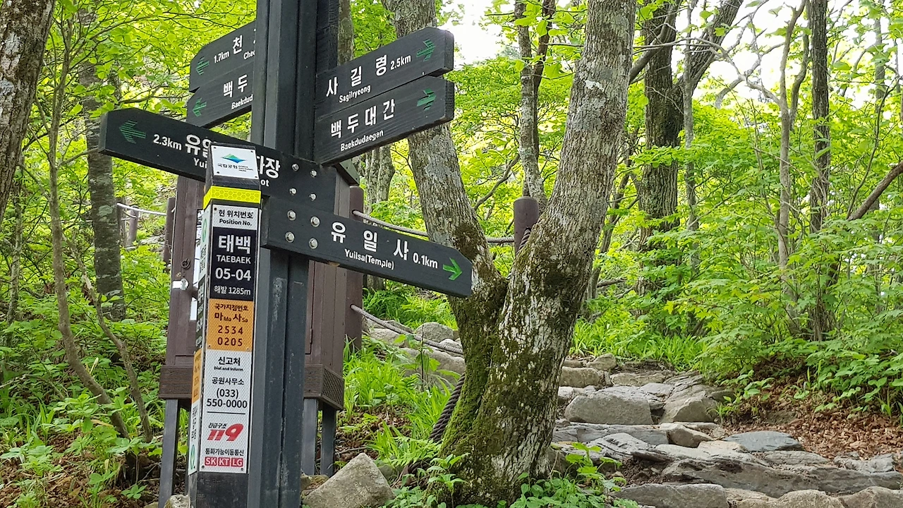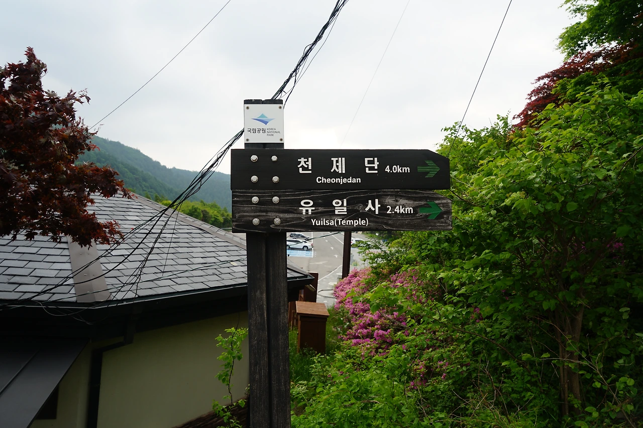 얼마나 갔을까 100미터 아래쪽에 유일사가 있었고 우리가 오르려는 천재단은 1.7k가 남아 있다는 푯말을 보며 엄청나게 올라왔는데 아직도 오르막이 멀구나 라는 걱정도 되었지만 어쩌랴 올라가야지