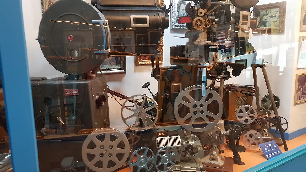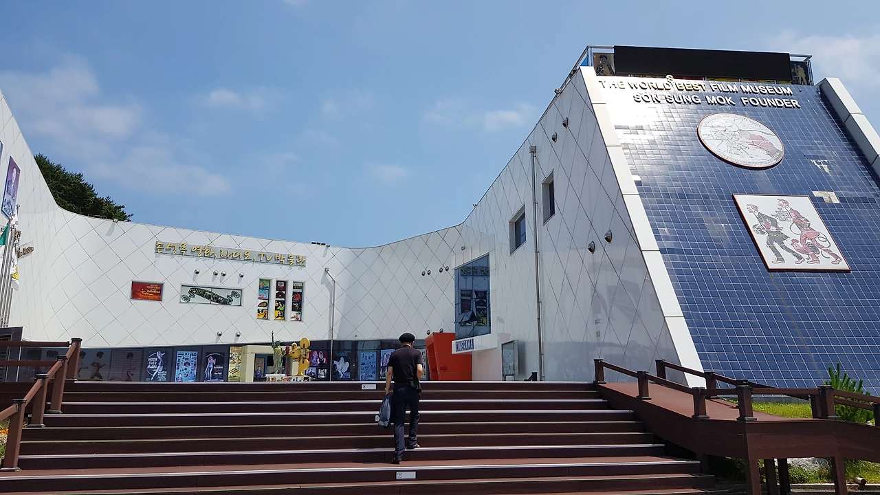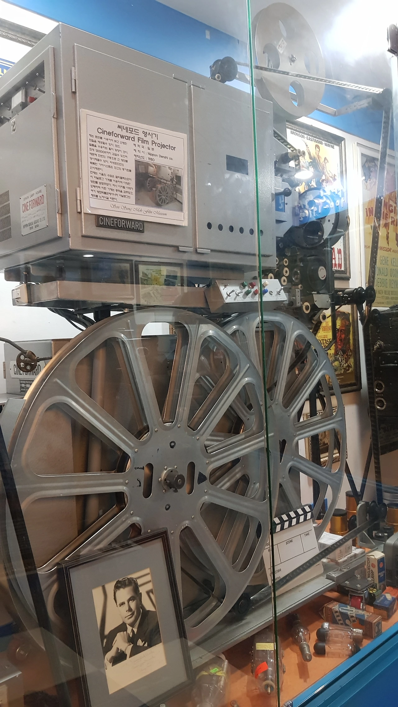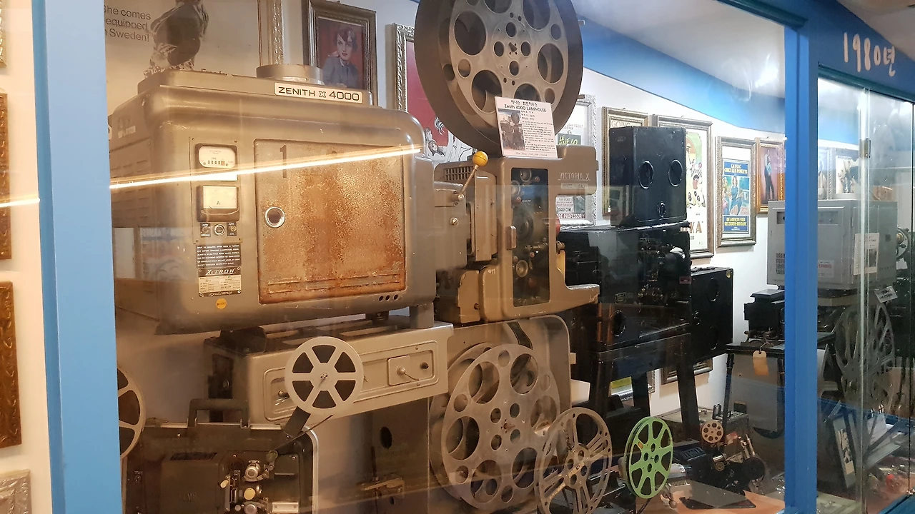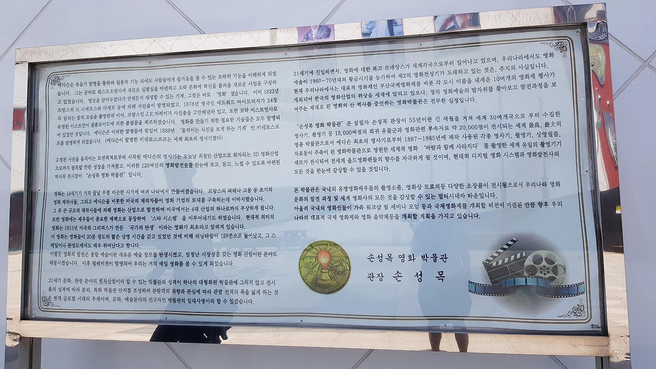 입구 벽면에는 손성목 관장님의 박물관의 여러 역사적인 소개와 바람 등을 안내하고 있었는데 55년이란 긴 세월 동안 세계 30여 개국으로부터 수집한 영사기 촬영기 등 15,000여 점의 희귀 유물들과 영화에 관련된 부속자료 약 20,000여 점이 전시되어 세계 최고, 최대의 명품 박물관으로 에디슨 최초의 영사기, 1887-1965년 제작 사용된 각종 영사기, 촬영기, 상영 필름과 자료들이 주축이 된 전시장이다