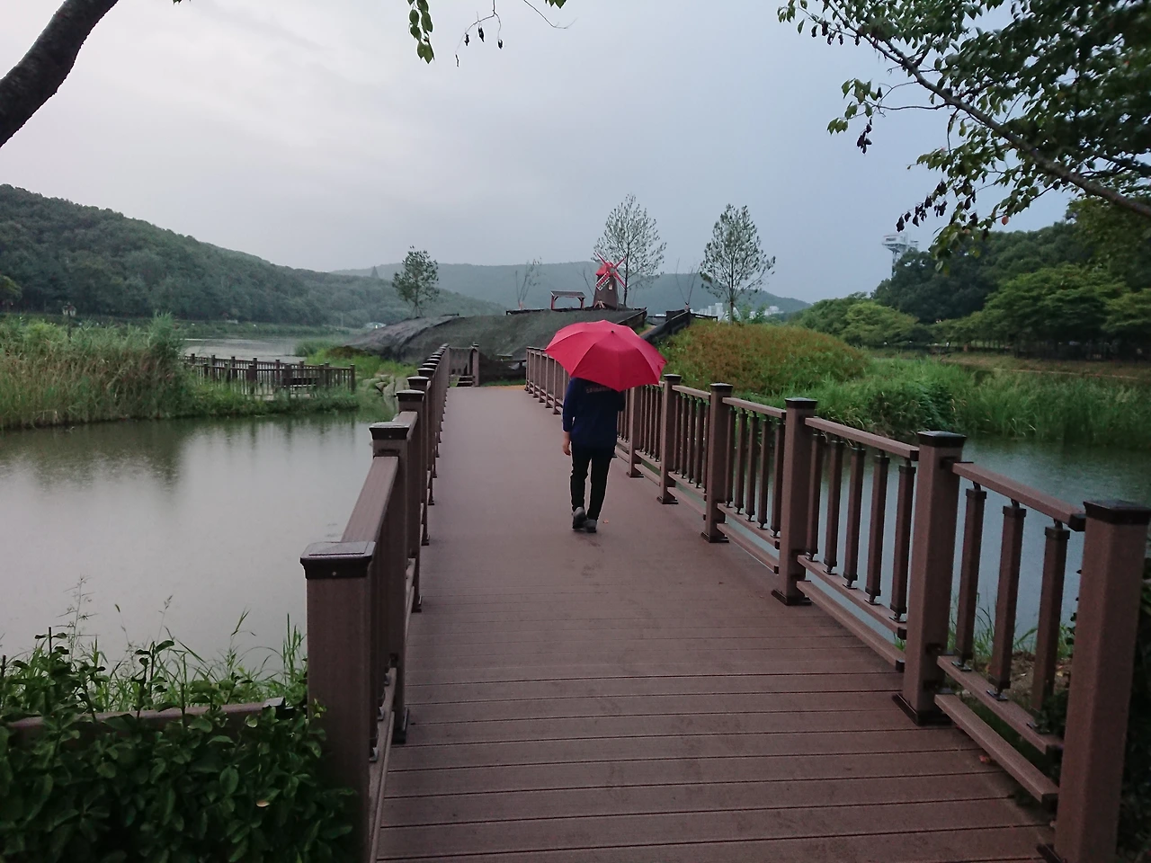 빨간 우산 쓰고 걷는 호반 길