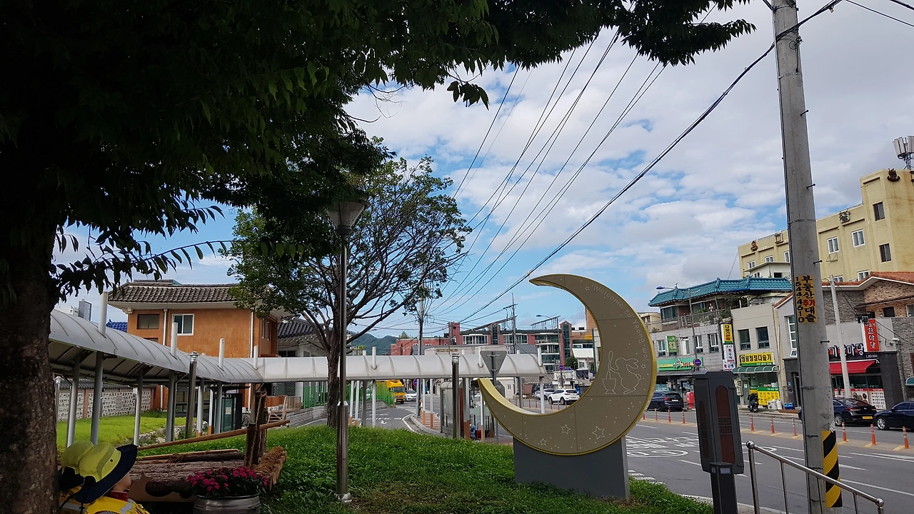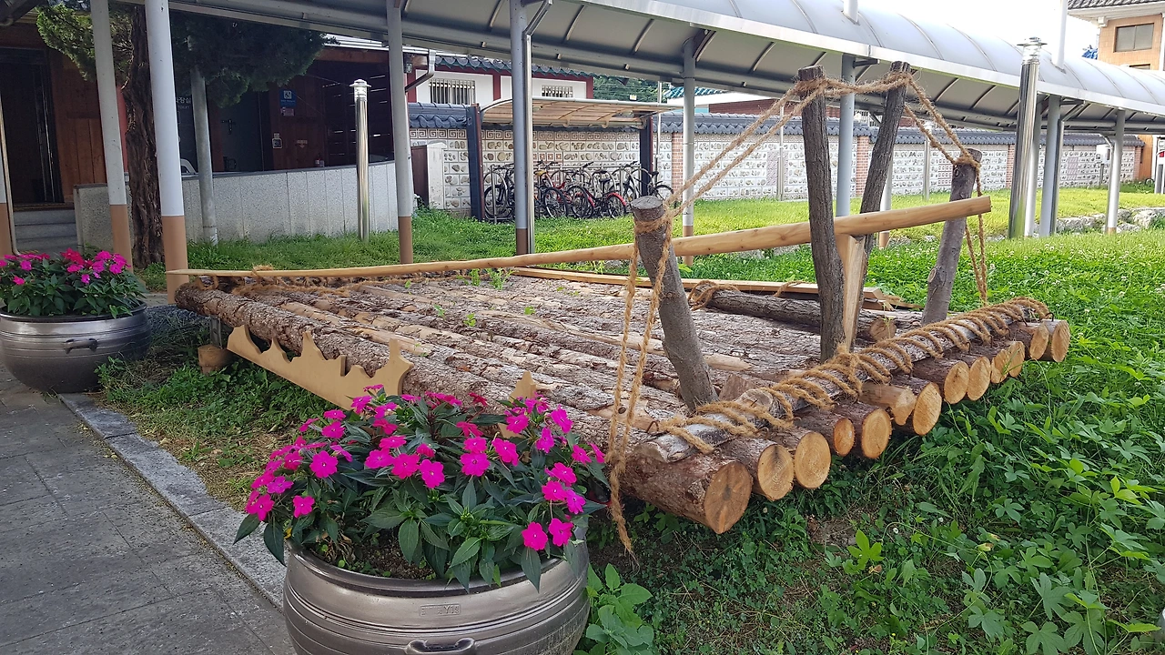 화사한 화분 옆 터에는 통나무 뗏목을 만들어 전시해 두었고 그 앞쪽으로 땅에 내려와 쉬고 있는 멋진 초승달이 앞으로 채워 갈 미래를 꿈꾸고 있었다