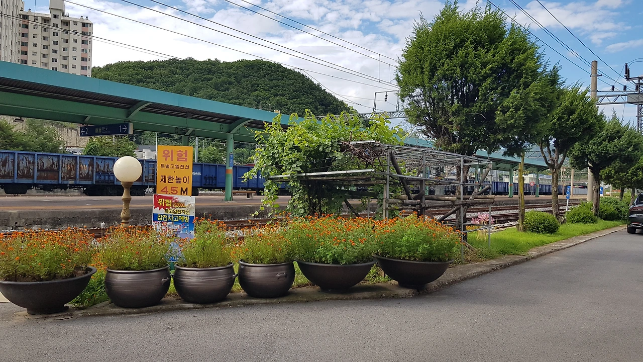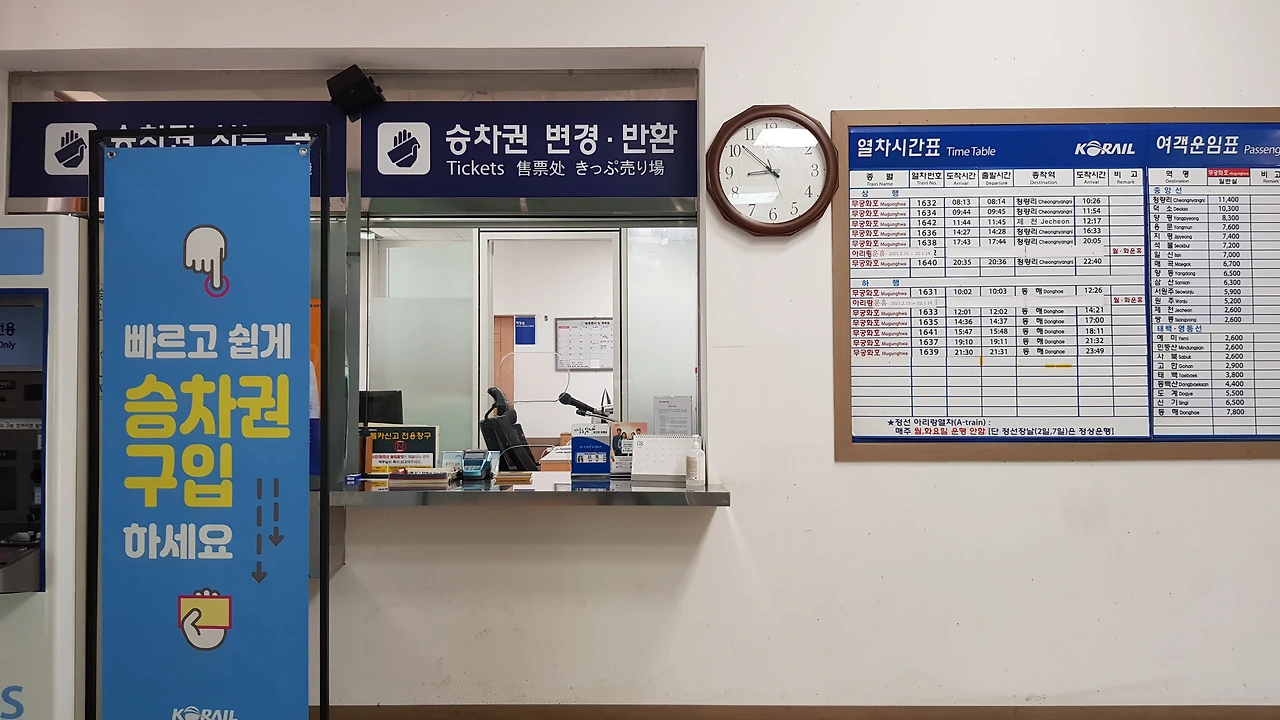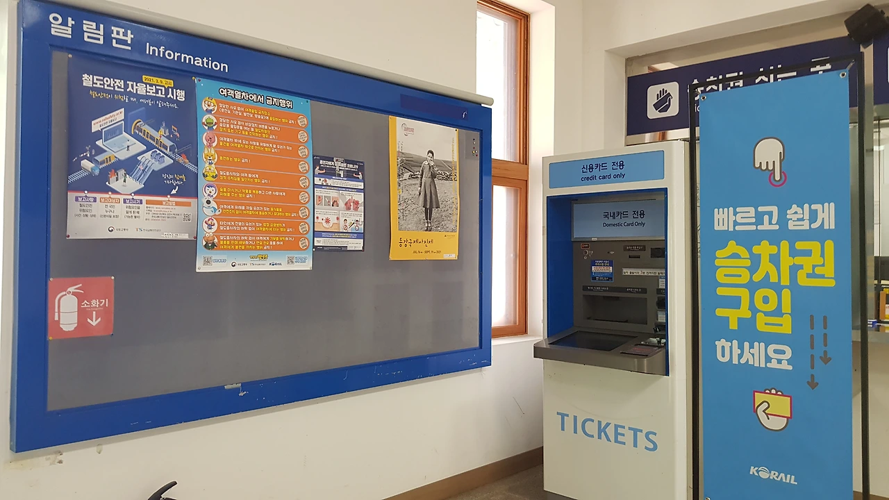 아직 무궁화호 열차가 운영되는 역사는 깔끔하고 깨끗했으며 열차를 기다리는 대합실에는 코로나로 거리두기 자리 표시가 있어 전국 어디나 코로나의 기세가 등등함을 여기서도 느껴야 했다