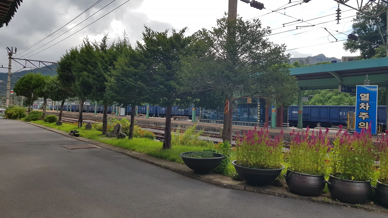 문이 활짝 열린 차 타는 곳으로 내어다본 철로에는 달리고 싶은 객차들이 잠을 자고 있었으며 역시 강원도임을 알리는 푸르른 산들이 기다란 철로를 내려다보고 있었다
