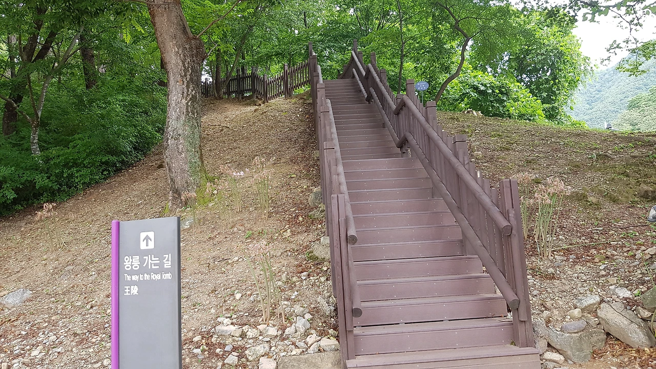 붉은 기둥이 아름다운 상쾌한 소나무 숲길을 기분 좋게 걷다 보니 저 앞으로 릉이 보인다
