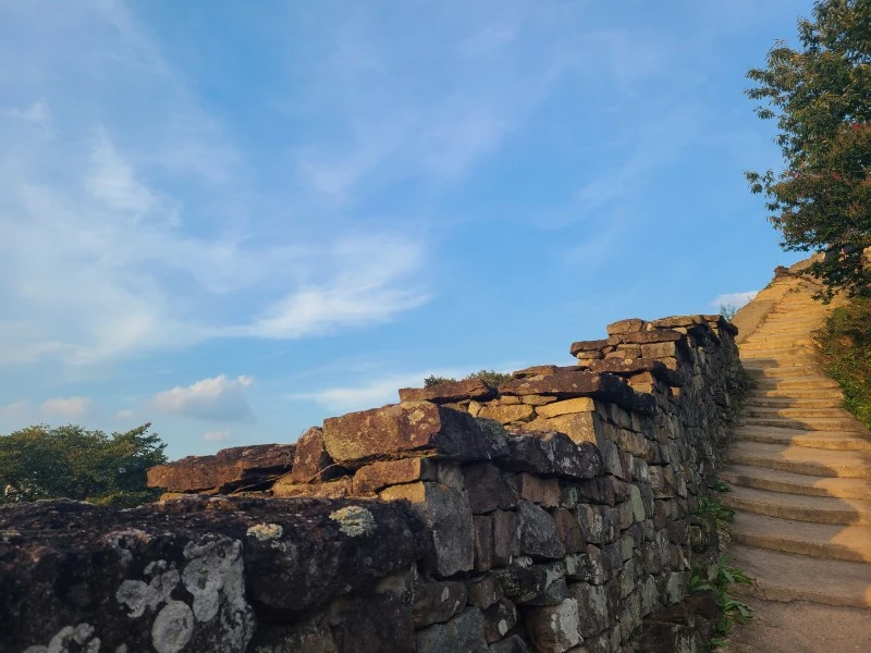 난간도 없는 높은 높이의 성곽 위에서 아래쪽으로 내려오는 경사 또한 급경사다
