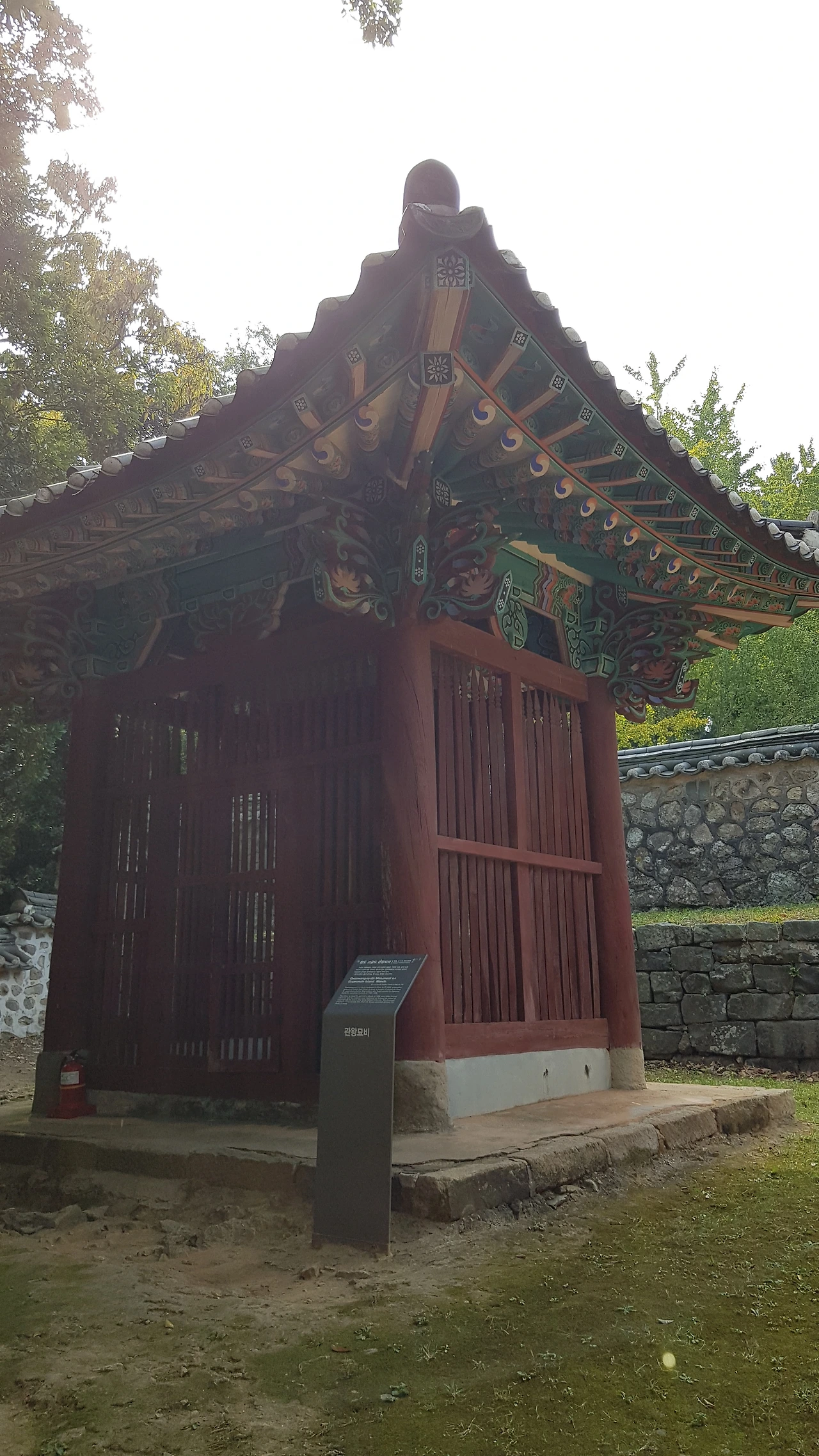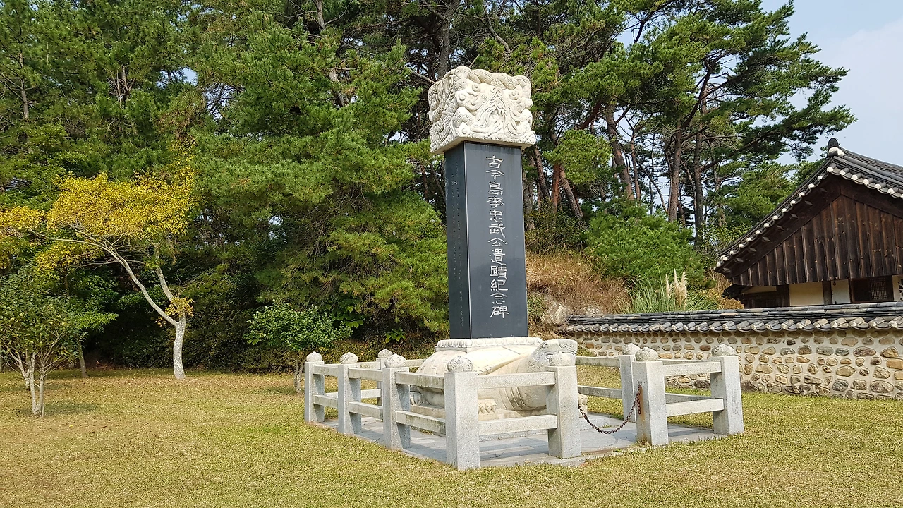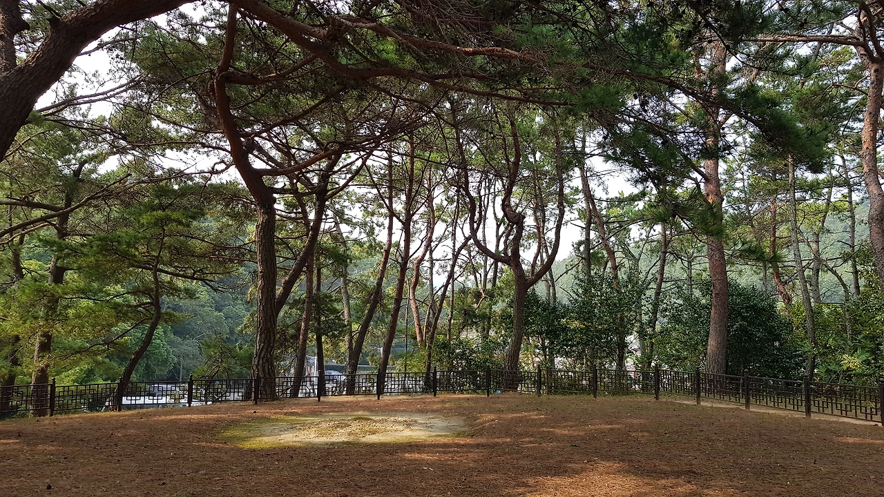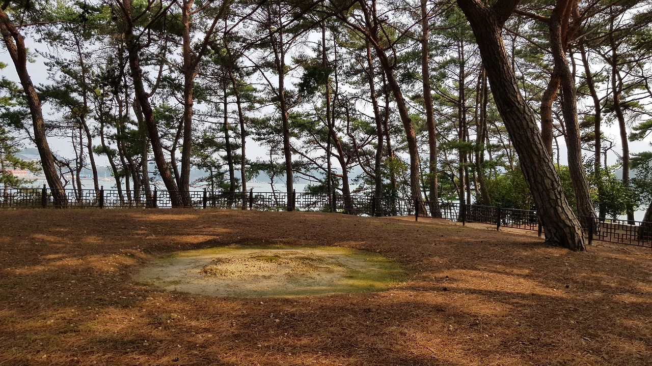 계단을 오르자 소나무가 우거진 아담한 동산에 둥근 울타리가 쳐져있고 중앙부위의 한 곳이 둥근 모양으로 다른 곳과는 흙도 다른 색이었다