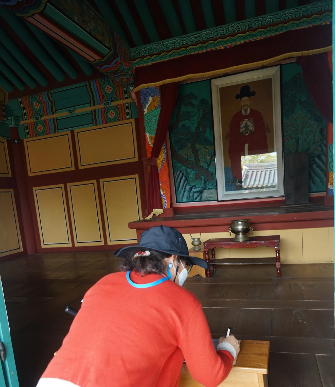 초상화를 바라보며 모함과 시기 질투에 어려움을 참 많이 당하시면서도 나라를 사랑하는 깊은 마음과 뛰어난 장수의 지혜로 거북선을 만들어 나라를 구하다 돌아가신 역사적 사실에 방명록에 나라를 위한 숭고하신 희생에 감사드린다는 글을 쓰고 있는 나 자신을 본다