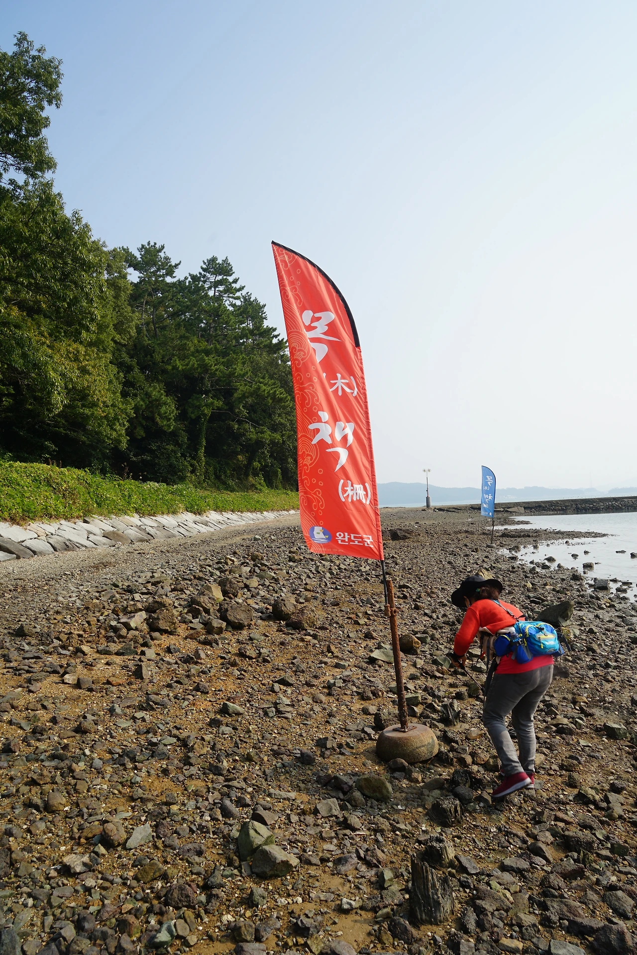 성을 돌아보고 자연경관에 취해보다가 장보고께서 외적의 침입을 막기 위해 직접 설치했다는 역사 속의 목책이 갯벌에 묻혀있다가 사라호 태풍 때 갯벌이 씻겨 나가면서 목책이 드러났다는설명이다 바닷가를 돌아 200여 m를 들어가니 바닷가에 깃발이 펄럭이고 있었고 그 밑으로 보니 거의 사라지고 바닥 부분이 조금씩 드러난 나무 기둥뿌리가 굵은 것도 좀 가는 것도 섞여 길게 줄지어 있음을 보니 가슴이 방망이질을 치는 것이었다